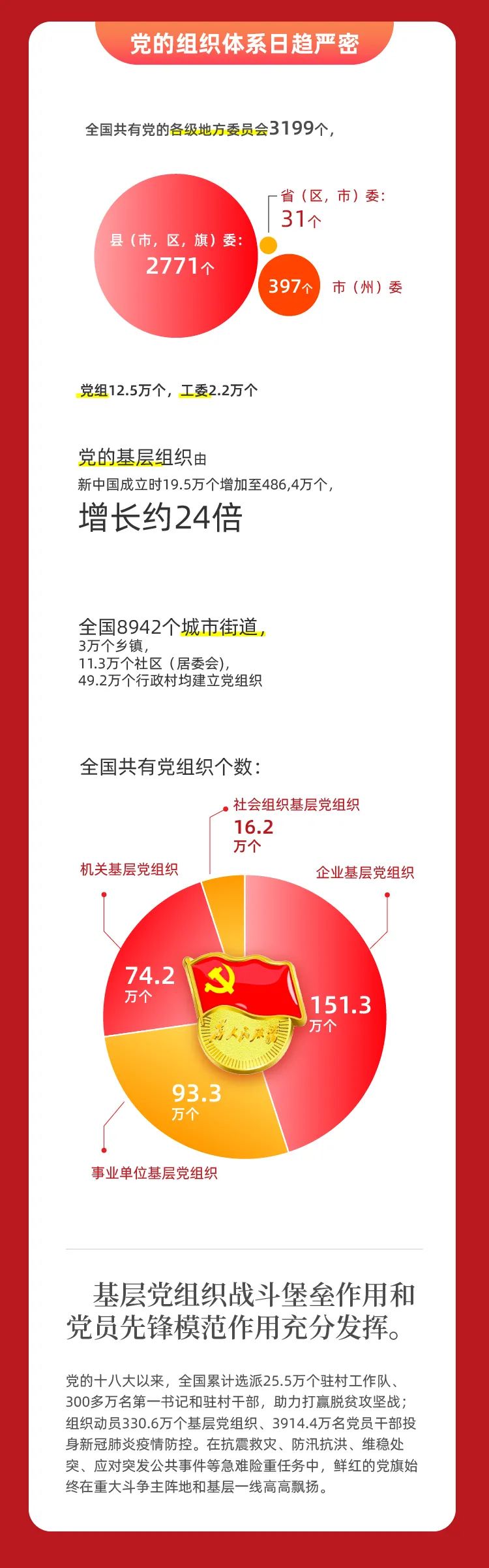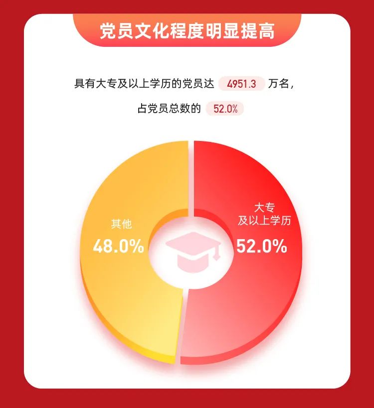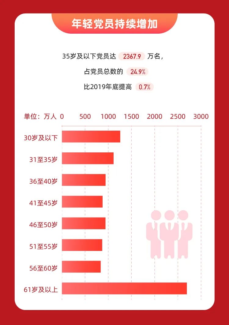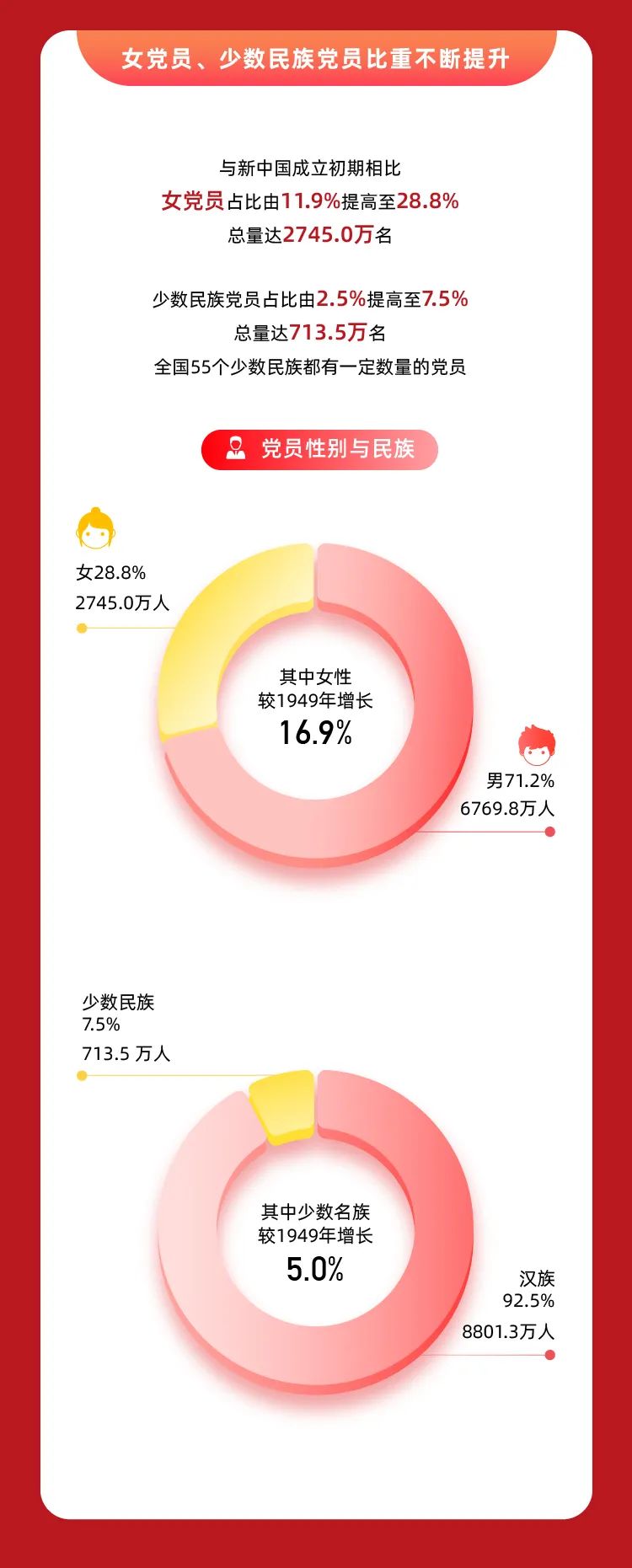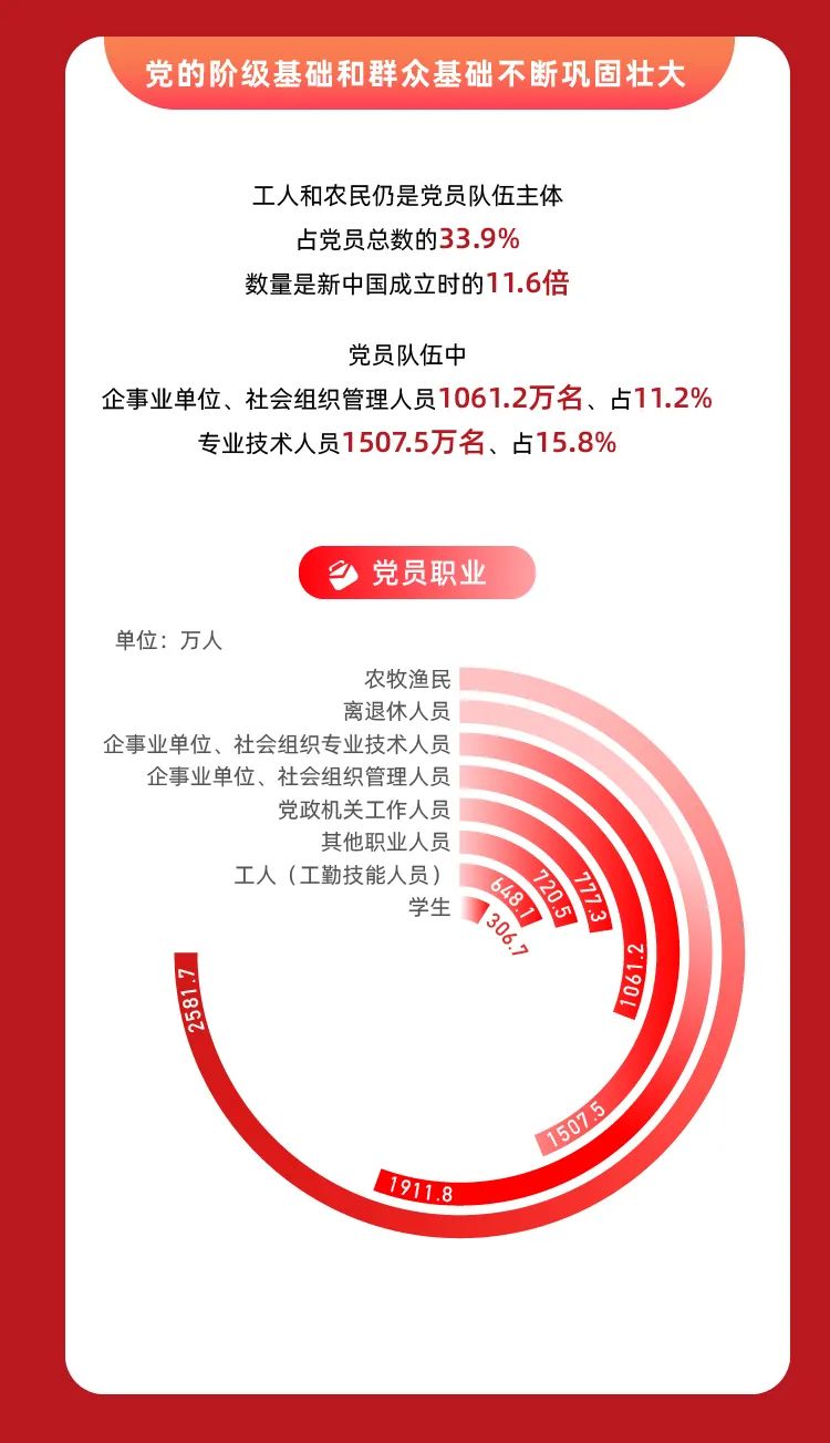 据中央组织部最新统计 截至2021年6月5日 中国共产党党员总数为9514.8万名 较2019年底增长3.5% 较1949年新中国成立时增长约20倍 2021年中国共产党党员是如何构成的? 一图看懂 ↓↓↓