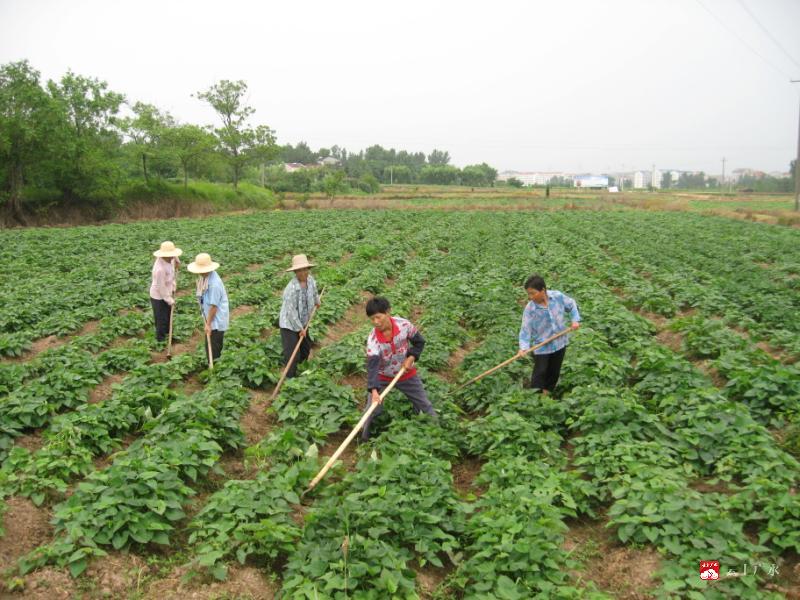 图为金悦公司合作农户在改良甘薯“鄂薯6号”田地锄草。(通讯员 马慧 摄)
