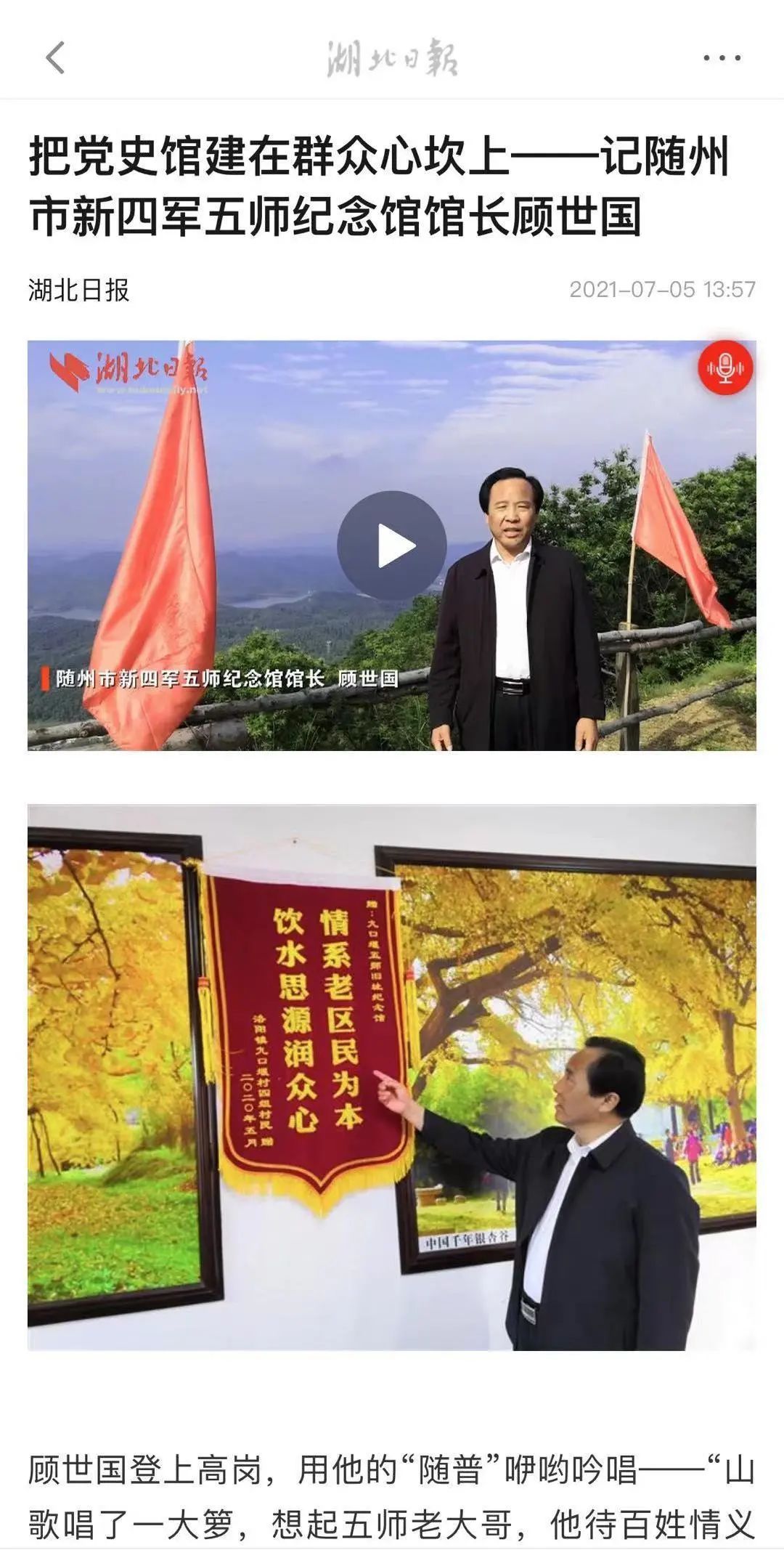 新五师纪念馆位于随州市曾都区洛阳镇九口堰村,早在党史学习教育之前,游客就接踵而至,日均千余人,高峰时日接3万多人,成为“网红村”。其实,是顾世国先成为网红,他先在龚店村当支书,把龚店建成网红,调九口堰来当馆长,又把九口堰建成网红。