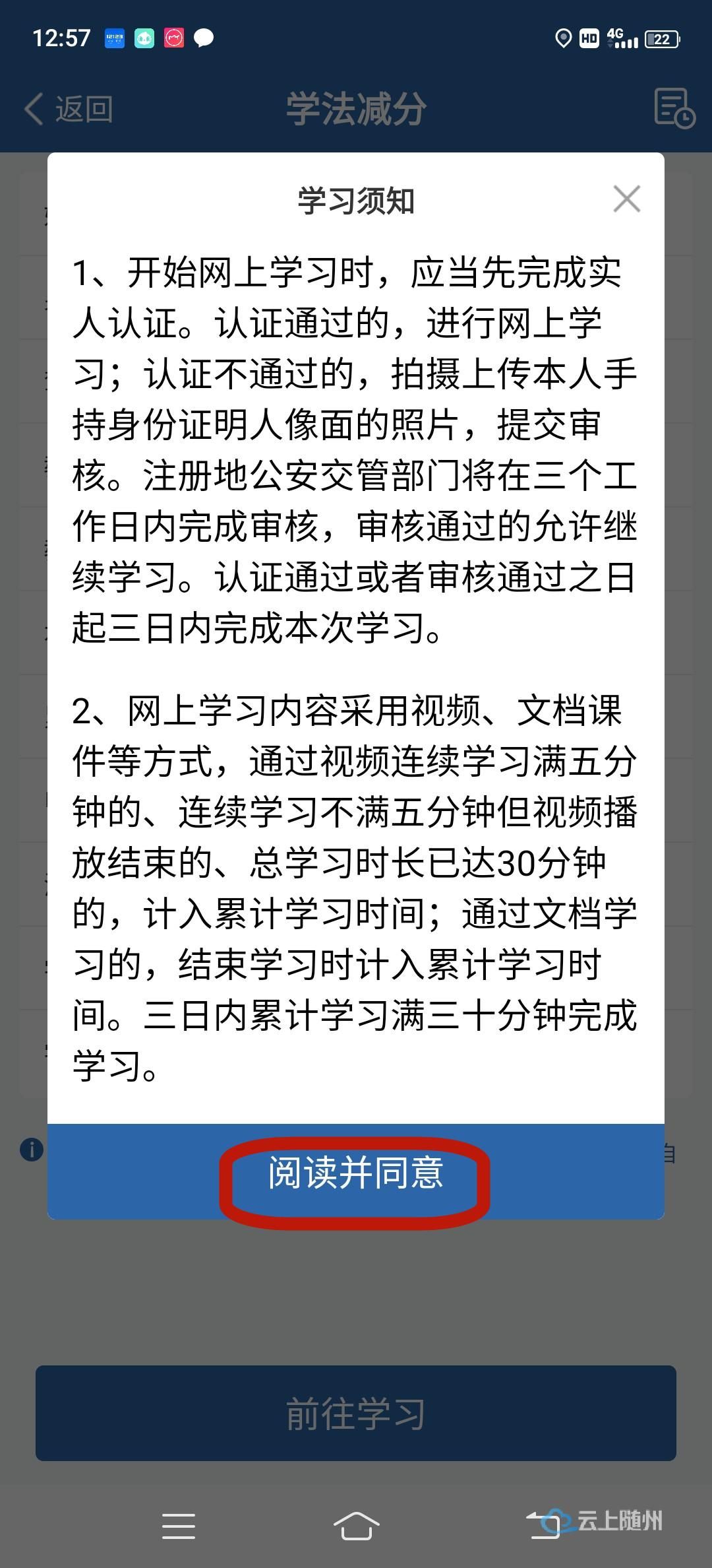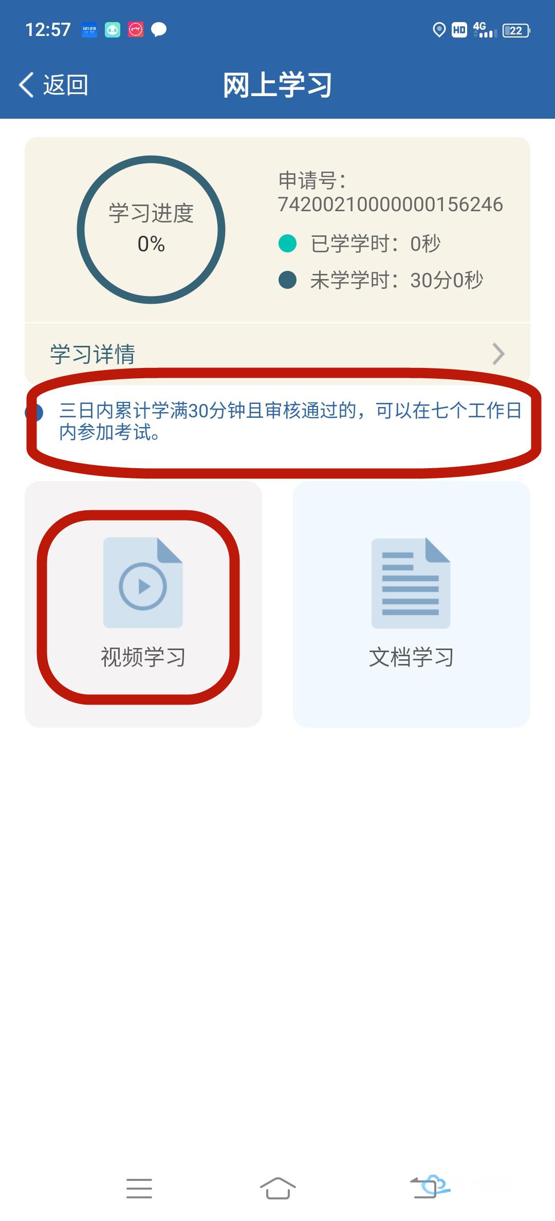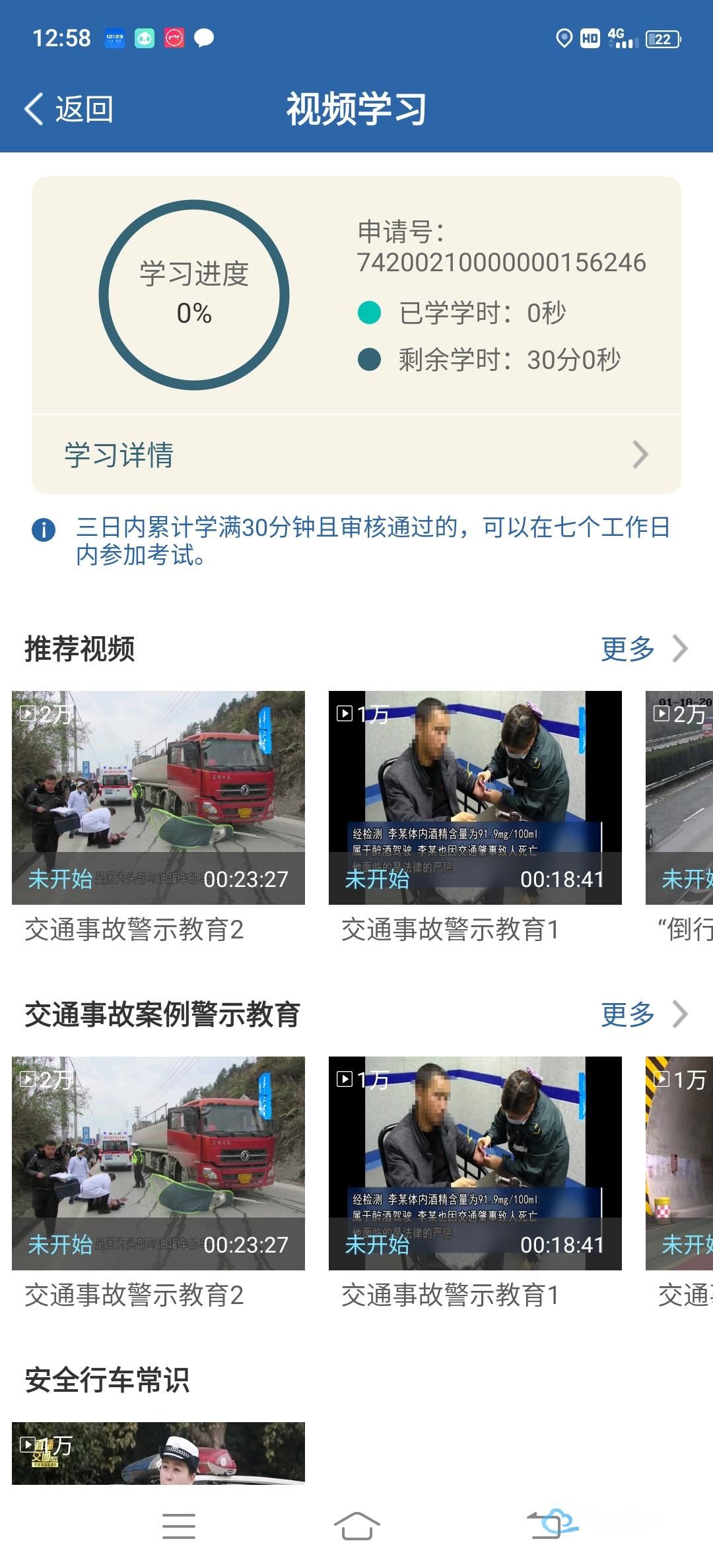 提交申请后,可关注网办进度,点击【去学习】,或已完成受理的,驾驶人用户点击【学法减分】按钮前往学习,进入学习界面点击【视频学习】。在学习过程中不定时弹出抓拍人脸界面,如比对通过则继续学习。