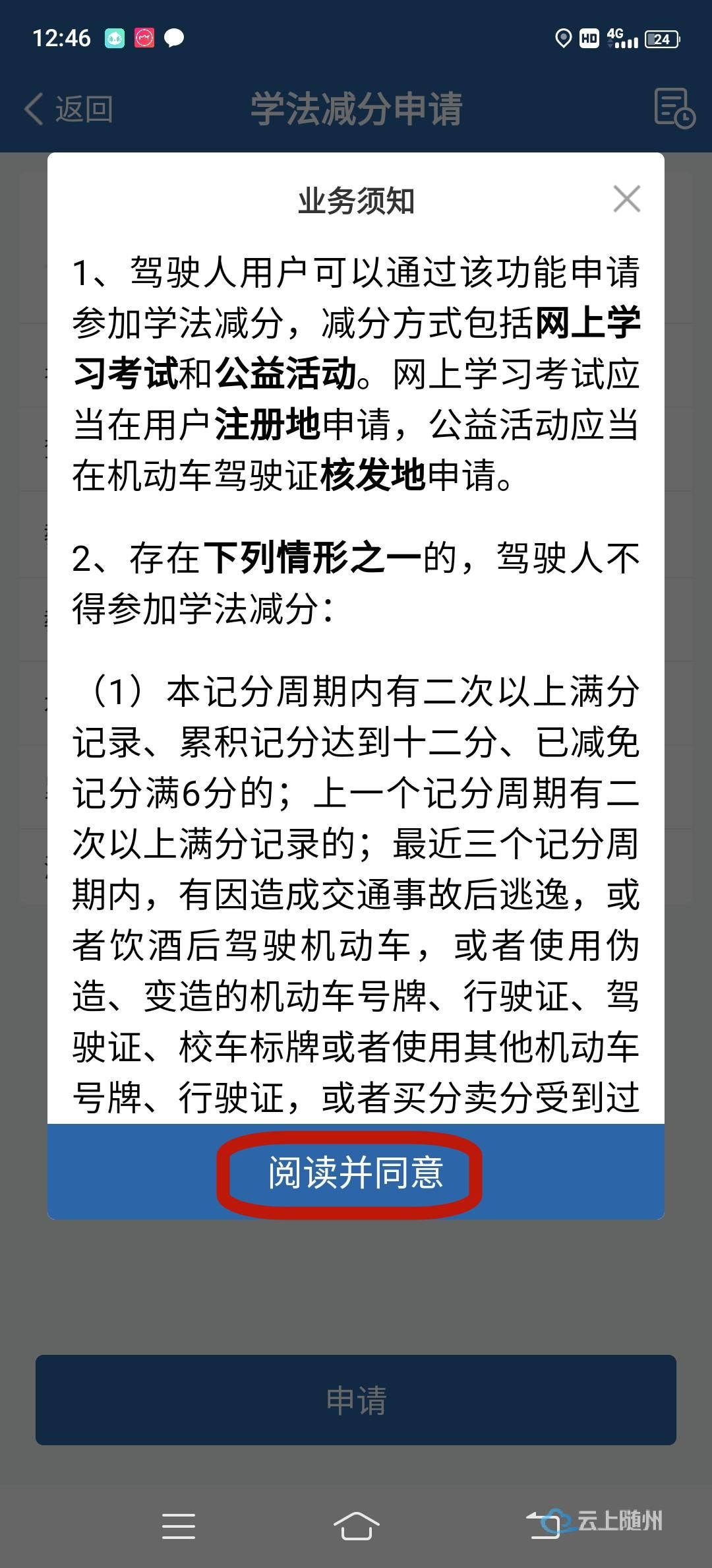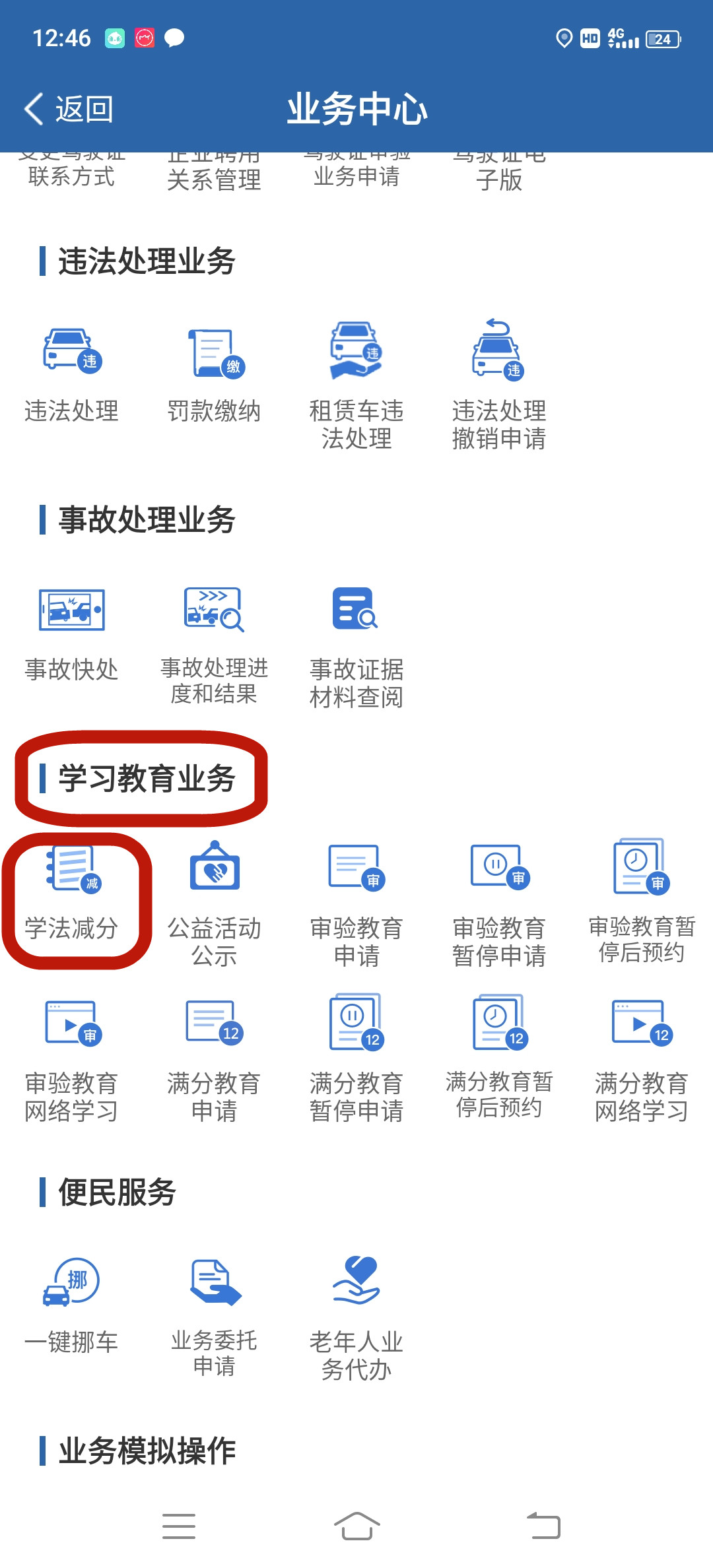 驾驶人用户点击首页【更多】按钮,进入【学习教育业务栏】找到【学法减分】。选择【网上学习】,点击【申请】按钮,阅读业务须知并同意,完成申请。