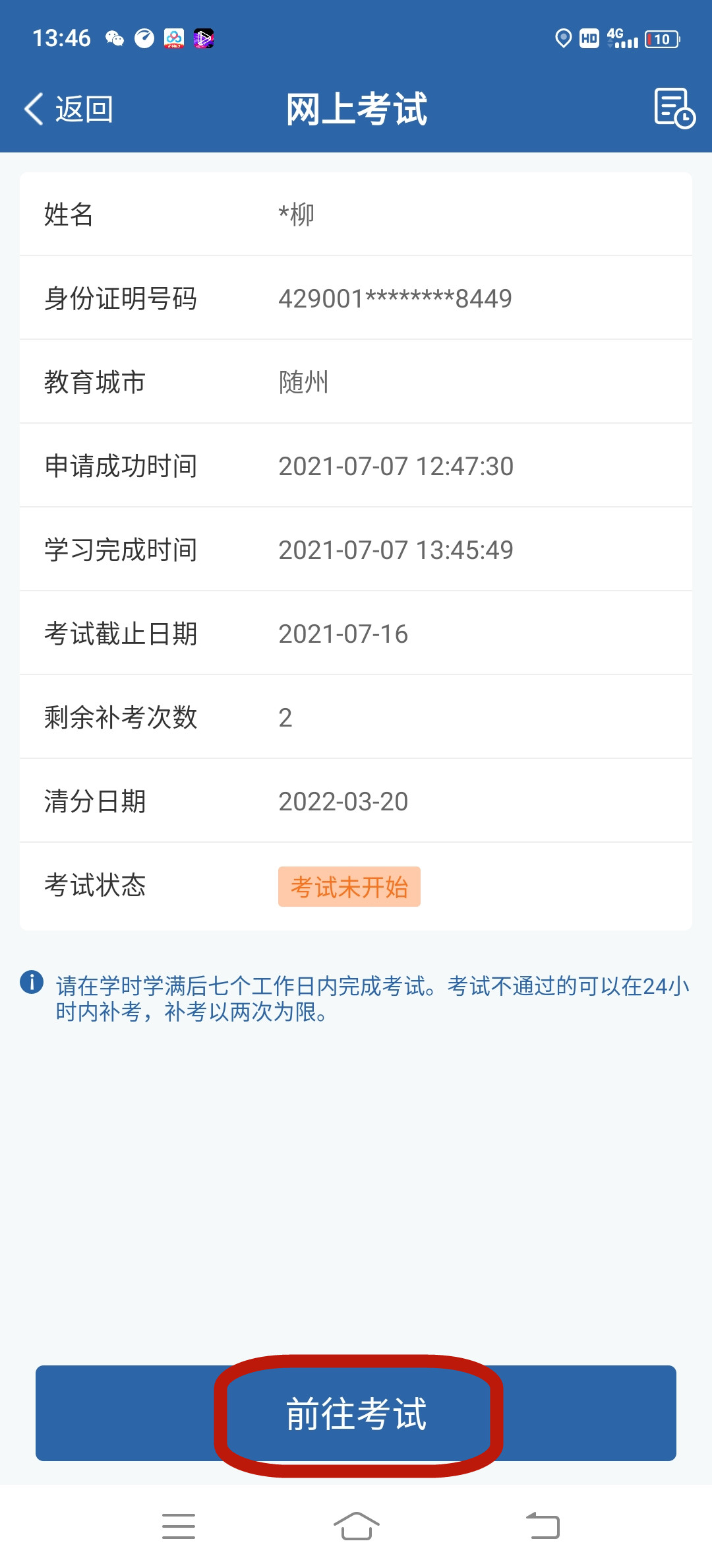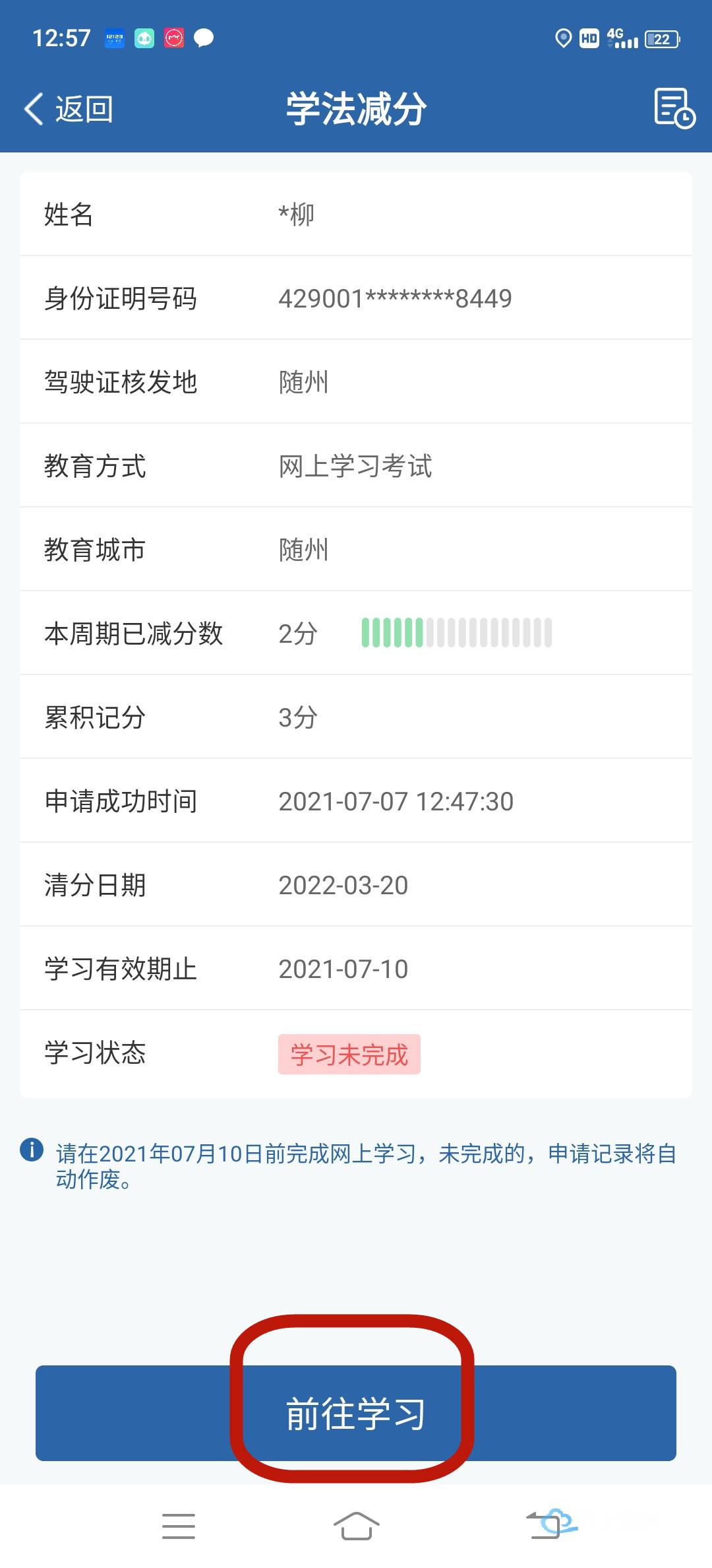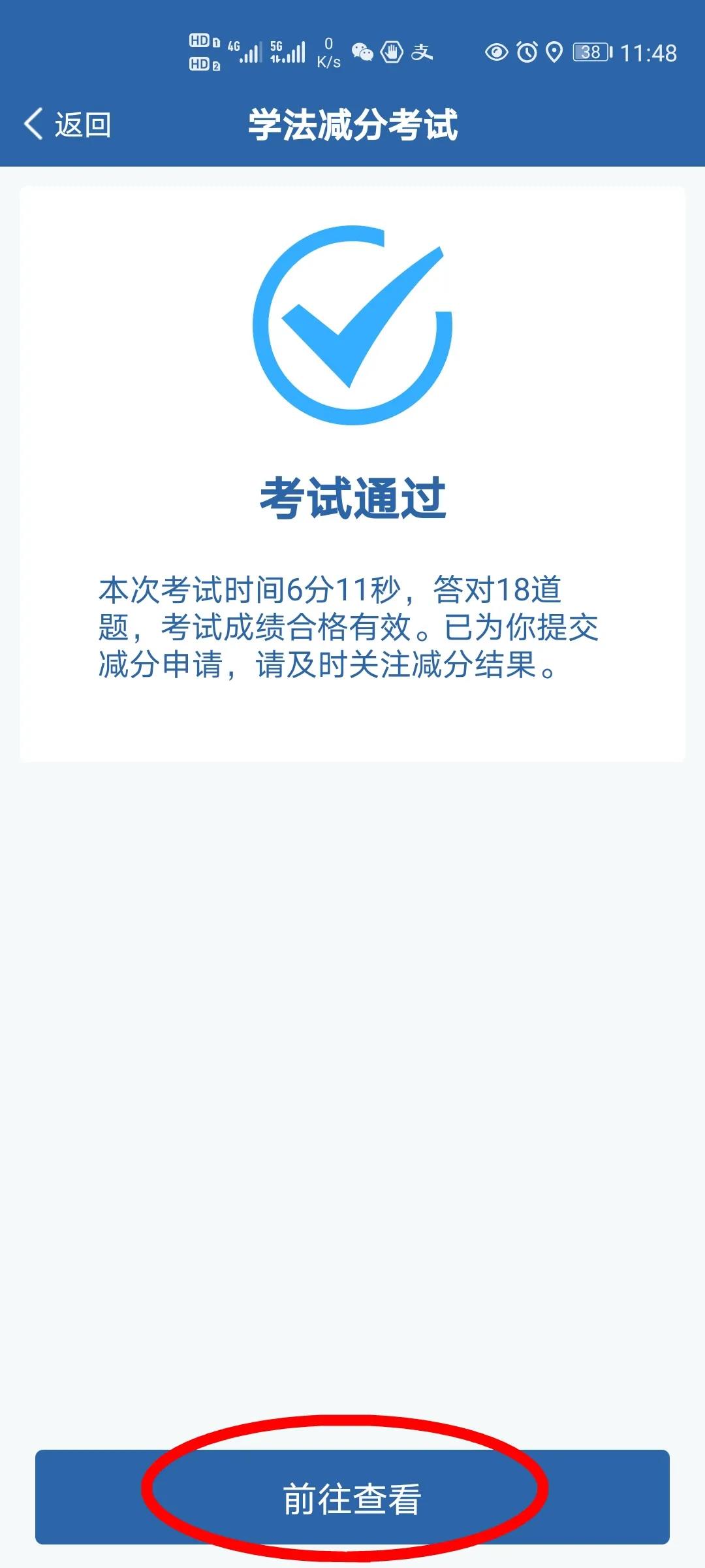 已完成学习的,驾驶人用户点击【学法减分】按钮,在已经完成学习的情况下,点击【前往考试】进入考试,如之前考试没通过且剩余考试次数还有的情况下,点击【前往补考】进入补考。