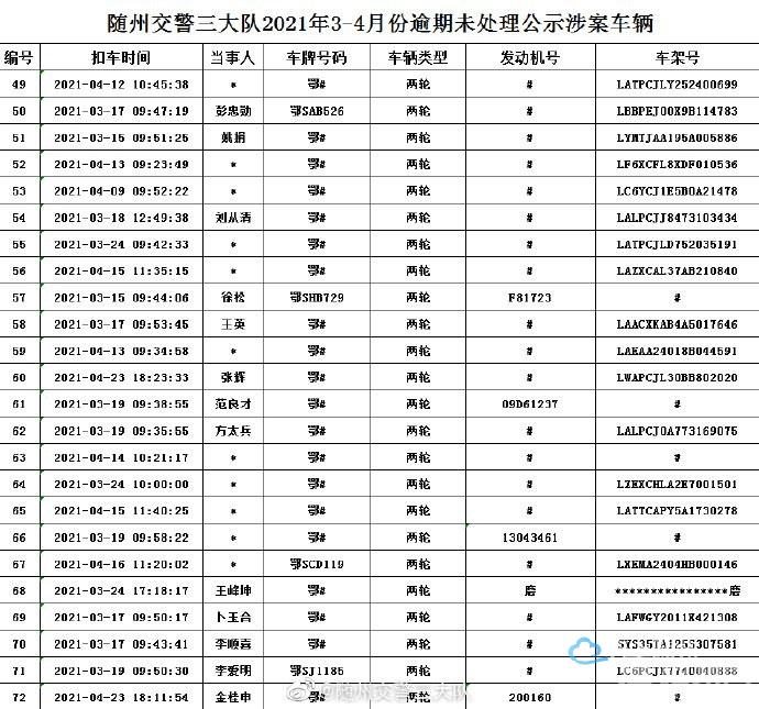 以下车辆在2021年03月01日至2021年04月30日期间因涉及道路交通违法,已被公安交通管理部门依法扣留,其驾驶人、所有人和管理人均未按规定期限到公安交通管理部门接受处理。根据《中华人民共和国道路交通安全法》第一百一十二条、《中华人民共和国道路交通安全法实施条例》第一百零七条等相关法律法规的规定,现予以公告。自本公告发布之日起经过三个月,当事人仍不前来接受处理的,公安交通管理部门将对扣留的车辆依法处理。