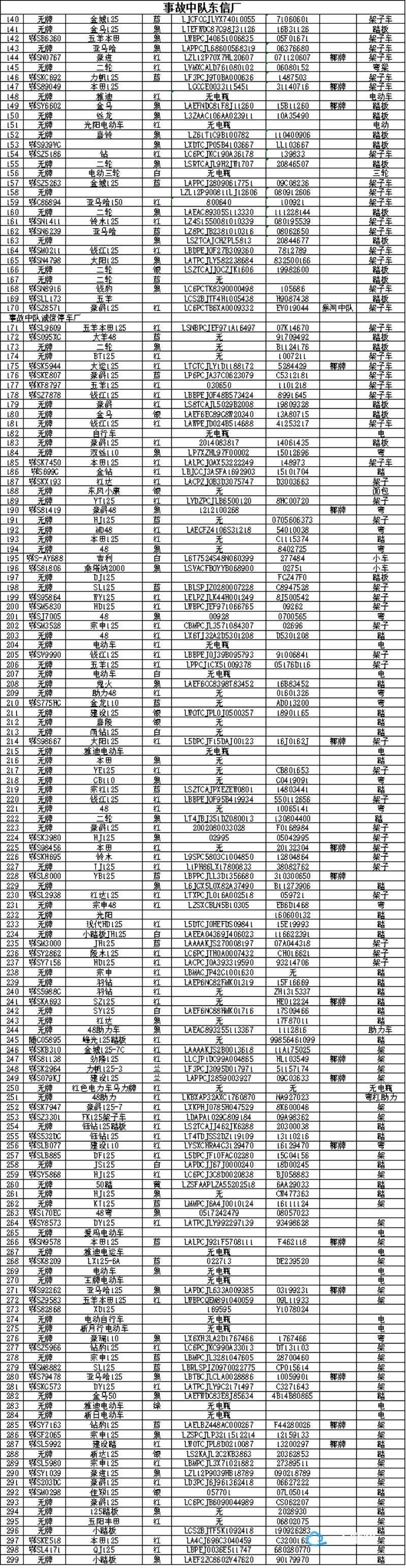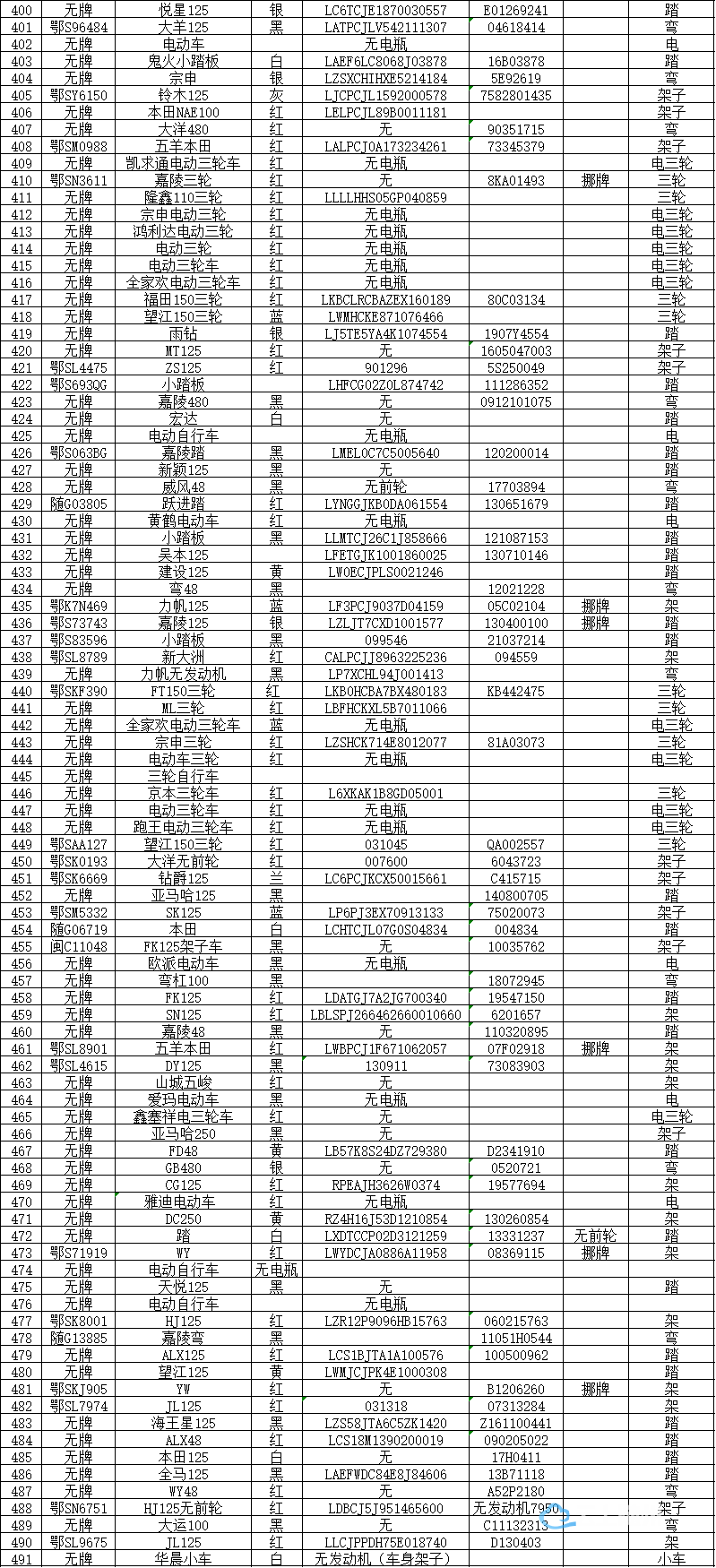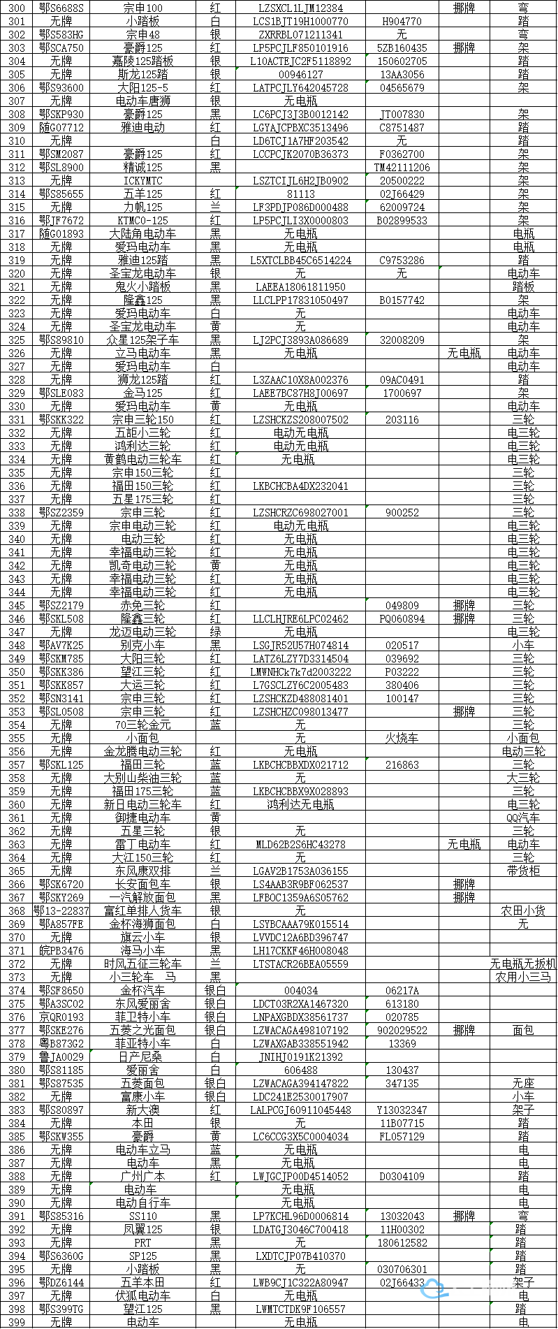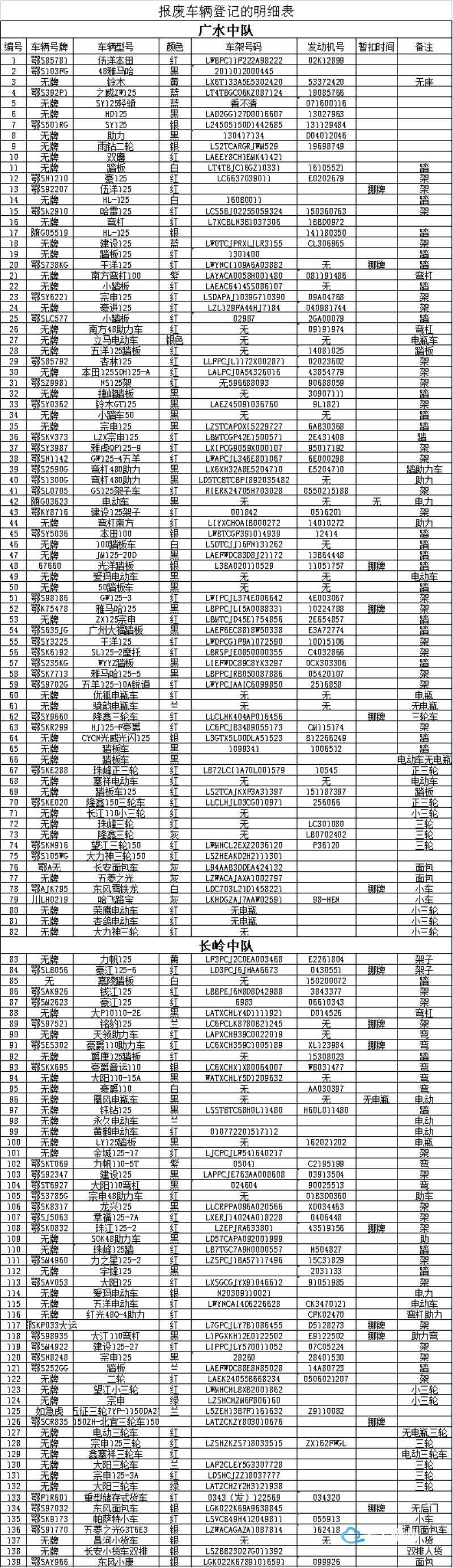 下列机动车辆因交通事故及交通违法被我队依法暂扣后尚未接受处理,请下列机动车所有人,自公告之日起三个月内到广水市公安局交通警察大队接收处理。预期不处理的,我队将根据《中华人民共和国道路交通安全法》第一百一十二条之规定对暂扣车辆依法处理。