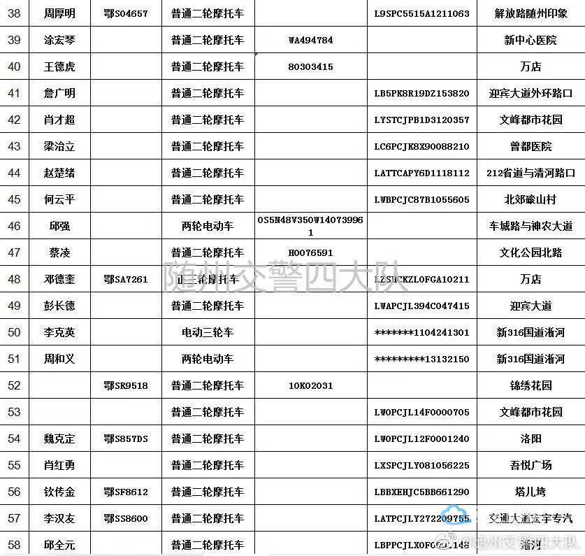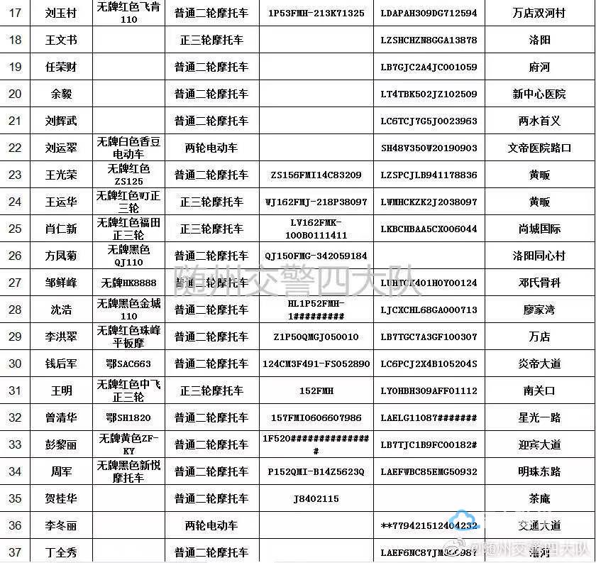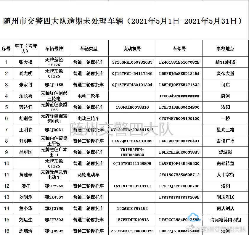 请以下车辆的驾驶人、所有人或管理人在本公告发布之日起三个月内携带身份证,驾驶证,行驶证或车辆合法来源证明到随州市公安局交通警察支队四大队接受处理。