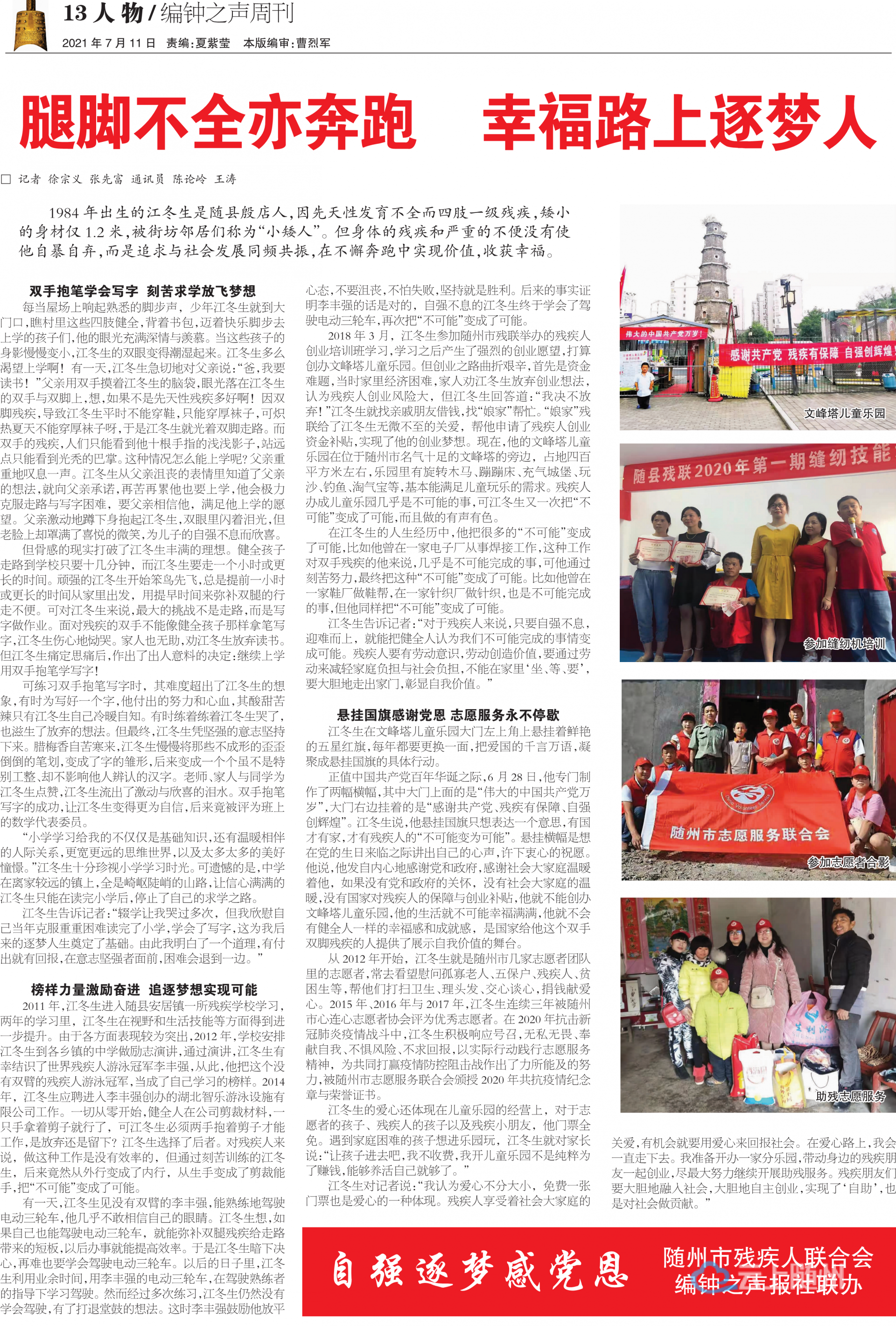 1984年出生的江冬生是随县殷店人,因先天性发育不全而四肢一级残疾,矮小的身材仅1.2米,被街坊邻居们称为“小矮人”。但身体的残疾和严重的不便没有使他自暴自弃,而是追求与社会发展同频共振,在不懈奔跑中实现价值,收获幸福。