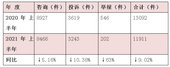 2021年上半年,全市市场监管部门12315平台共受理处理消费者诉求总量(含咨询、投诉、举报)共计11911件,比去年同期减少9.02%。