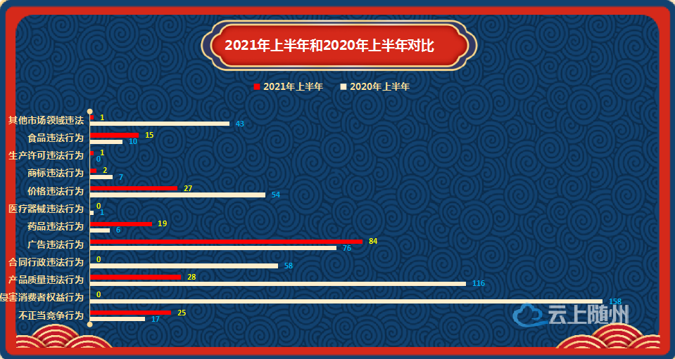 2021年上半年,全市市场监管系统共受理举报件202件,比上年同期减少了63%。其中广告违法行为84件,产品质量违法行为28件,价格违法行为27件,不正当竞争行为25件,药品违法行为19件,食品违法行为15件,商标违法行为2件,生产许可违法行为1件,其他市场领域违法行为1件。(详见图四)