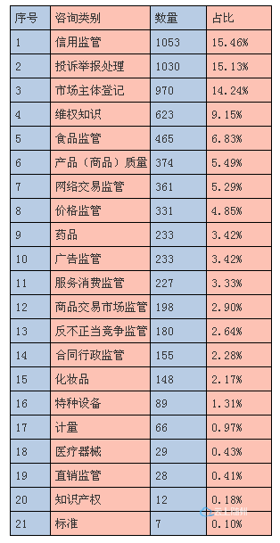 ——信用监管类。2021年上半年信用监管类咨询1053件。今年来总局发布加大对重点领域信用监管力度的相关意见,推进涉及公共安全和人民群众生命健康的市场监管重点领域信用监管,对于企业信息公示、信用承诺、失信惩戒、信用修复等措施不断完善。每年6月30日前也是各市场主体年报的期限,随着市场主体信用意识的增加,越来越多的来电人对年报进行咨询,以免超期或遗漏造成失信,也提醒各市场主体要不断强化信用约束,增强信用意识。