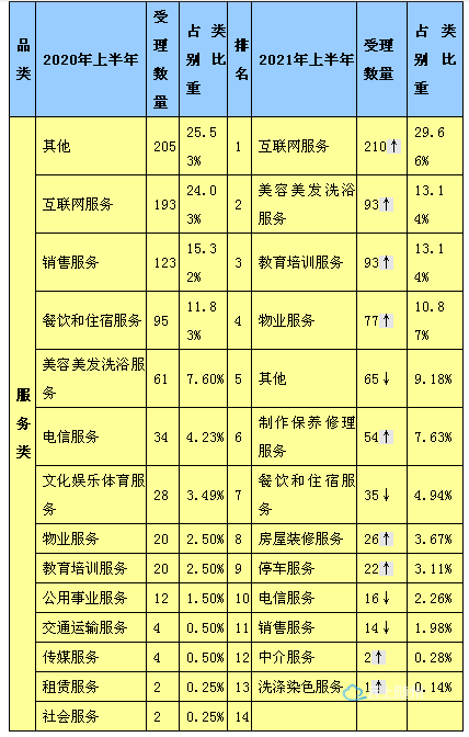 2021年上半年服务类投诉708件,同比减少11.83%。服务类投诉排名依次为:互联网服务、美容美发洗浴服务、教育培训服务、物业服务、其他服务、制作保养和维修服务、餐饮和住宿服务、房屋装修服务、停车服务、电信服务、销售服务、中介服务、洗涤染色服务。其中互联网服务高居第一,随着现代科技不断发展,网络已经与社会大众的工作、娱乐、生活紧密结合在一起。新的经营业态、营商方式以及消费模式不断涌现,随着而来有关新兴行业的消费纠纷也日趋增多(见表三)