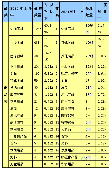 2021年上半年商品类投诉2535件,同比减少9.98%。商品类投诉排名依次为:交通工具、特殊食品、其他商品、一般食品、服装鞋帽、药品、房屋、通讯产品、家用电器、装修建材、医疗器械、特种设备、化妆品、首饰、燃料、家居用品、照摄像产品、农资用品;商品类投诉较为集中的为交通工具、特殊食品、一般食品和日常生活用品等,占到总数的80%以上。