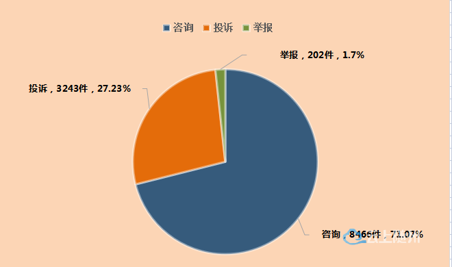 其中受理咨询8466件、投诉3243件、举报202件,分别占受理总量的71.07%、27.23%、1.7%。为消费者挽回经济损失577.78万元,投诉和举报的法定时限办结率为100%。(见图一)。
