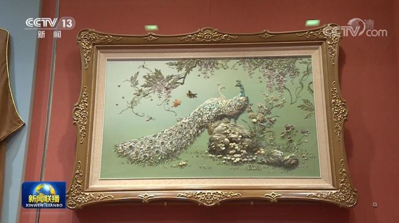 △朝鲜劳动党总书记金正恩和夫人赠送的贝壳镶嵌装饰画