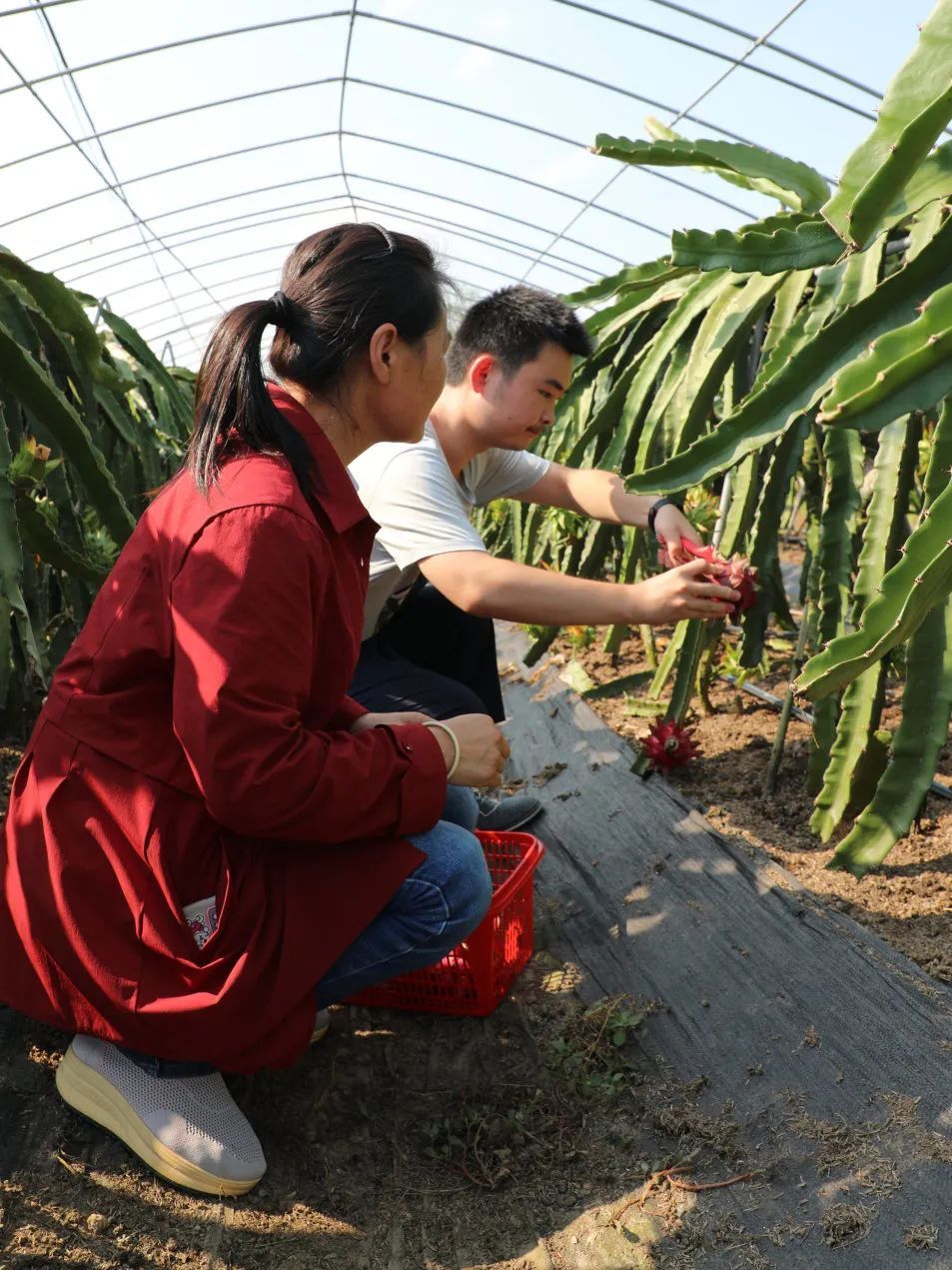 7月14日下午3时许,室外温度35摄氏度,走进位于南郊街道邓家老湾村的盛亩生态园,烈日下,马艳梅上装身穿一件春装外套、长袖衬衣,下装穿着牛仔裤、秋裤。王志翔正在基地里忙着剪火龙果,妈妈马艳梅在一旁打手势,教他如何剪枝、如何与客户沟通。见到笔者,王志翔腼腆地笑着与笔者招了招手,又专心致志地学习着采摘水果。
