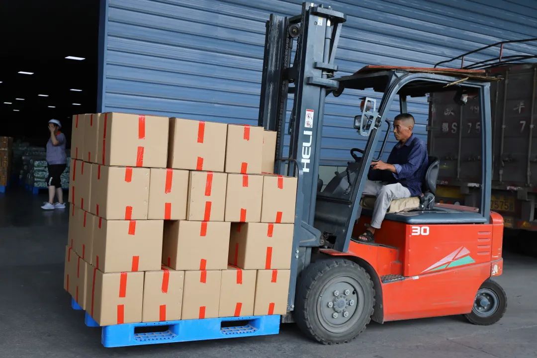 一辆辆张贴“随州市曾都区人民政府驰援郑州救灾物资”红色条幅的物资保障供应车整装待发,一袋袋热干面被传送带运到供应车上,一箱箱面条整齐划一的码在供应车里。