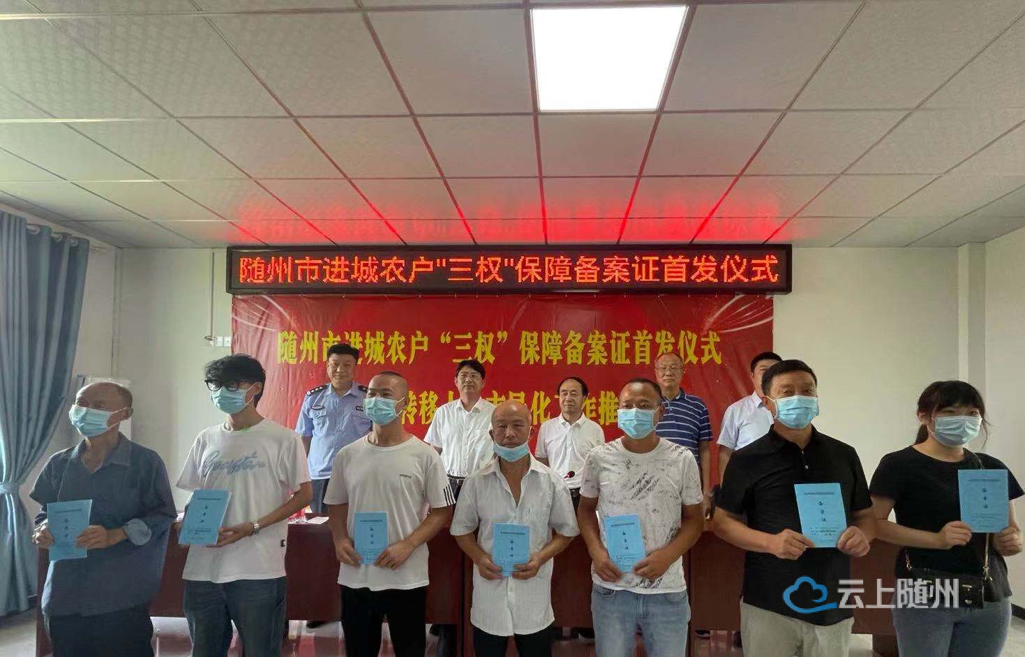 7月22日,全市进城农户“三权”保障备案证首发仪式暨农业转移人口市民化工作推进会在随县均川镇幸福社区举行,幸福社区的7名已办理迁移户籍的农民获得进城农户“三权”保障备案证。
