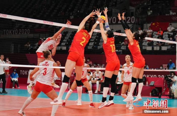 北京时间7月25日下午,在东京奥运会女排小组赛首轮中,中国女排对阵土耳其女排。最终中国女排爆冷0:3不敌土耳其女排,三局比分为21:25、14:25、14:25。图为中国女排拦网。 中新社记者 杜洋 摄
