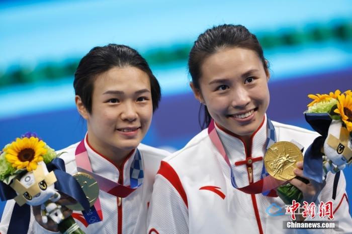 当地时间7月25日,施廷懋(左)、王涵在颁奖仪式上。当日,东京奥运会跳水女子双人三米板决赛在东京水上运动中心举行,中国组合施廷懋、王涵以326.40分摘得金牌。 中新社记者 富田 摄