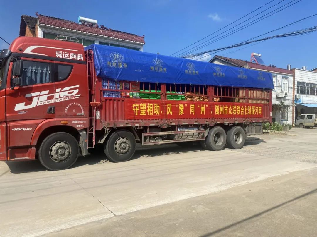 7月25日下午,满载着随县部分农民合作社、家庭农场爱心物资的卡车从安居镇驶入高速,送往河南灾区。