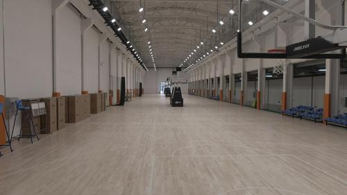 走进综合馆看到,室内篮球、足球、网球、羽毛球场馆及攀岩区等都已完成布场,馆内层高15米、过道宽近6米,空间大、视线开阔。3片篮球场铺设双龙骨枫木地板,增强缓冲以保护膝盖等人体关节,配电子记分牌,设可移动观众席,每片场地之间装有隔离软网,篮球架可移动以满足不同运动需求。14片羽毛球场、2片网球场、5人制足球场均是专业运动地面,球车、裁判席等一应俱全;馆内通道地面则涂施美观干净的环氧地坪漆。乒乓球室、台球室、射击室、轮滑室等正在进行内装收尾施工。