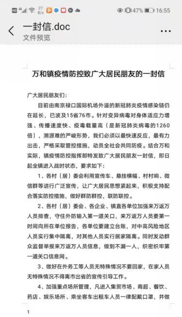 利用微信群转发《万和镇疫情防控致广大人民群众的一封信》,并组织张贴500余份。