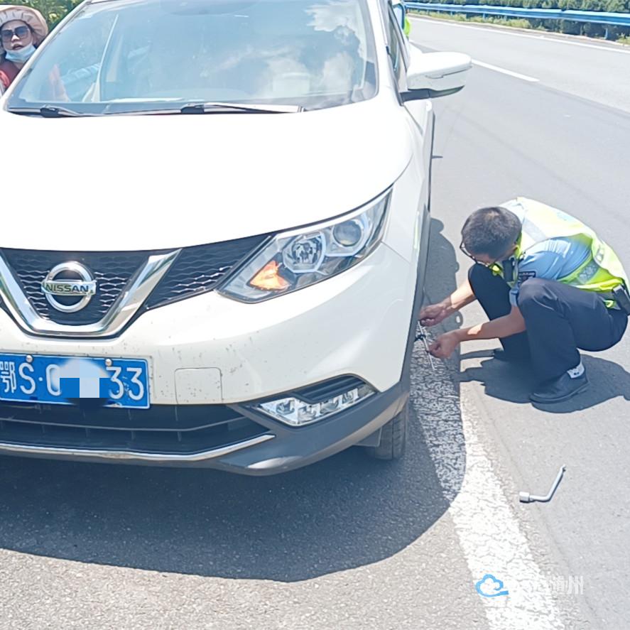 民警询问得知,车子行驶至此处时左前胎突然发生爆胎,因第一次遇到这种难事,车主瞿女士又惊又怕,束手无策。雷斌和李涛在车辆后方立即设置警示牌、疏导后方车辆,确保道路交通安全。张鑫用瞿女士车上配备的千斤顶等换胎工具,帮忙卸下废胎,又将车辆备胎换好。