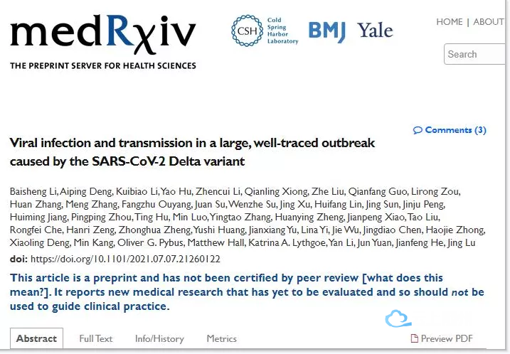 ▲7月12日,中国广东省疾控制中心的一组研究人员在medRxiv预印本平台发布的研究论文指出,德尔塔毒株感染者的呼吸道病毒载量是原始毒株感染者的1260倍。截图自medRxiv