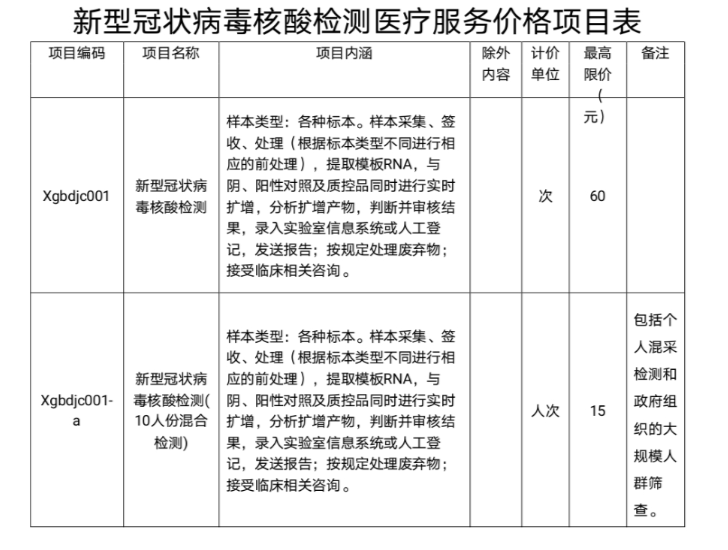 一、公立医疗机构开展新型冠状病毒核酸检测项目的最高限价由每次80元调整为60元。设立混合检测项目,公立医疗机构混合检测10人份的最高限价为每人次15元。
