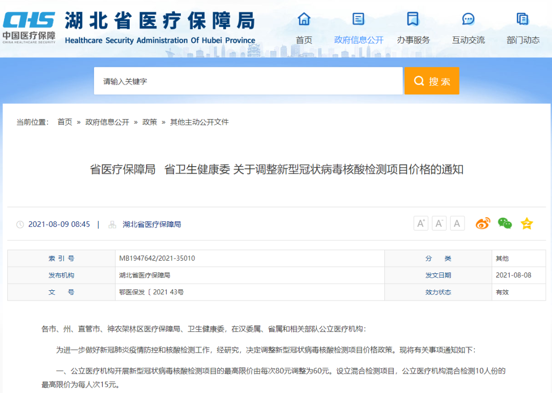 今天,湖北省医疗保障局、省卫生健康委发布关于调整新型冠状病毒核酸检测项目价格的通知。公立医疗机构开展新型冠状病毒核酸检测项目的最高限价由每次80元调整为60元。设立混合检测项目,公立医疗机构混合检测10人份的最高限价为每人次15元。通知详情如下: