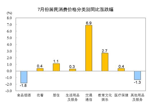 其他七大类价格同比六涨一降。其中,交通通信、教育文化娱乐、居住价格分别上涨6.9%、2.7%和1.1%,衣着、医疗保健、生活用品及服务价格分别上涨0.4%、0.4%和0.3%;其他用品及服务价格下降1.3%。