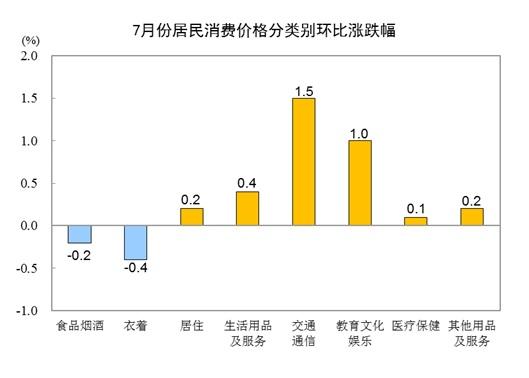 其他七大类价格环比六涨一降。其中,交通通信、教育文化娱乐、生活用品及服务价格分别上涨1.5%、1.0%和0.4%,居住、其他用品及服务、医疗保健价格分别上涨0.2%、0.2%和0.1%;衣着价格下降0.4%。