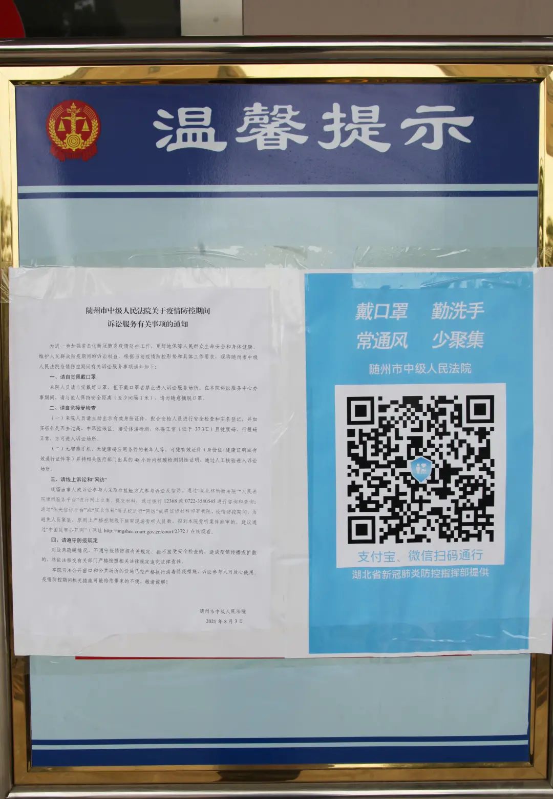 市中院迅速恢复机关疫情防控领导小组及相关专班,强化统一指挥调度。实行院领导24小时应急值班制度,坚持日报告、零报告制度,全面摸排全体干警及家人的情况。坚持办公场所每日消杀,加强诉讼服务中心疫情防控工作,发布《随州市中级人民法院关于疫情防控期间诉讼服务有关事项的通知》,要求来院办理诉讼业务的人员必须佩戴口罩,做好体温检测、进门消毒,落实健康码扫描、身份信息登记等疫情防控措施。备足机关防疫物资,做好紧急预案,实行定期例会制,加强对基层法院防控工作的督促指导。