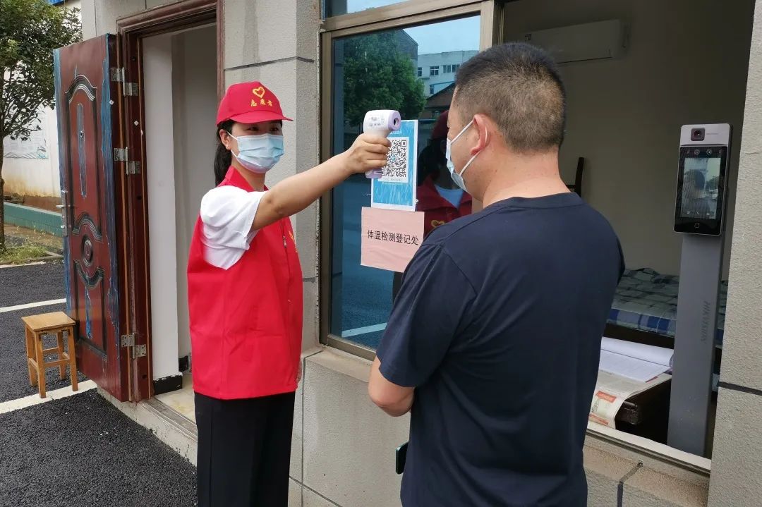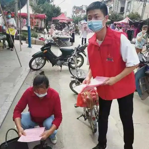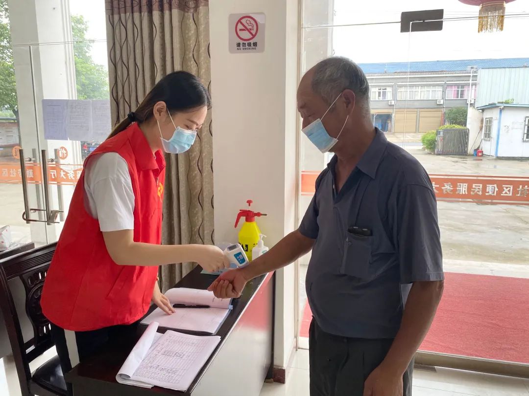 县检察院团委组织志愿者在厉山镇勤劳社区参与疫情防控工作,为办事群众测量体温、宣传疫情防控知识。