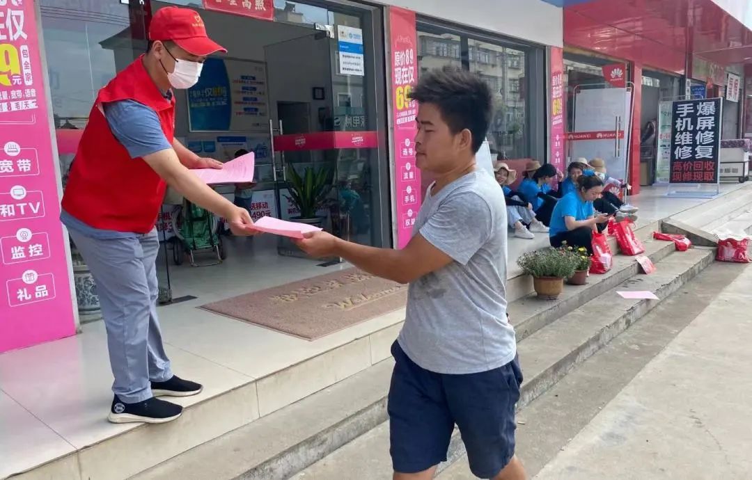 小林镇团委组织青年志愿者发放疫情防控宣传单,在核酸检测临时采样点维护现场秩序。