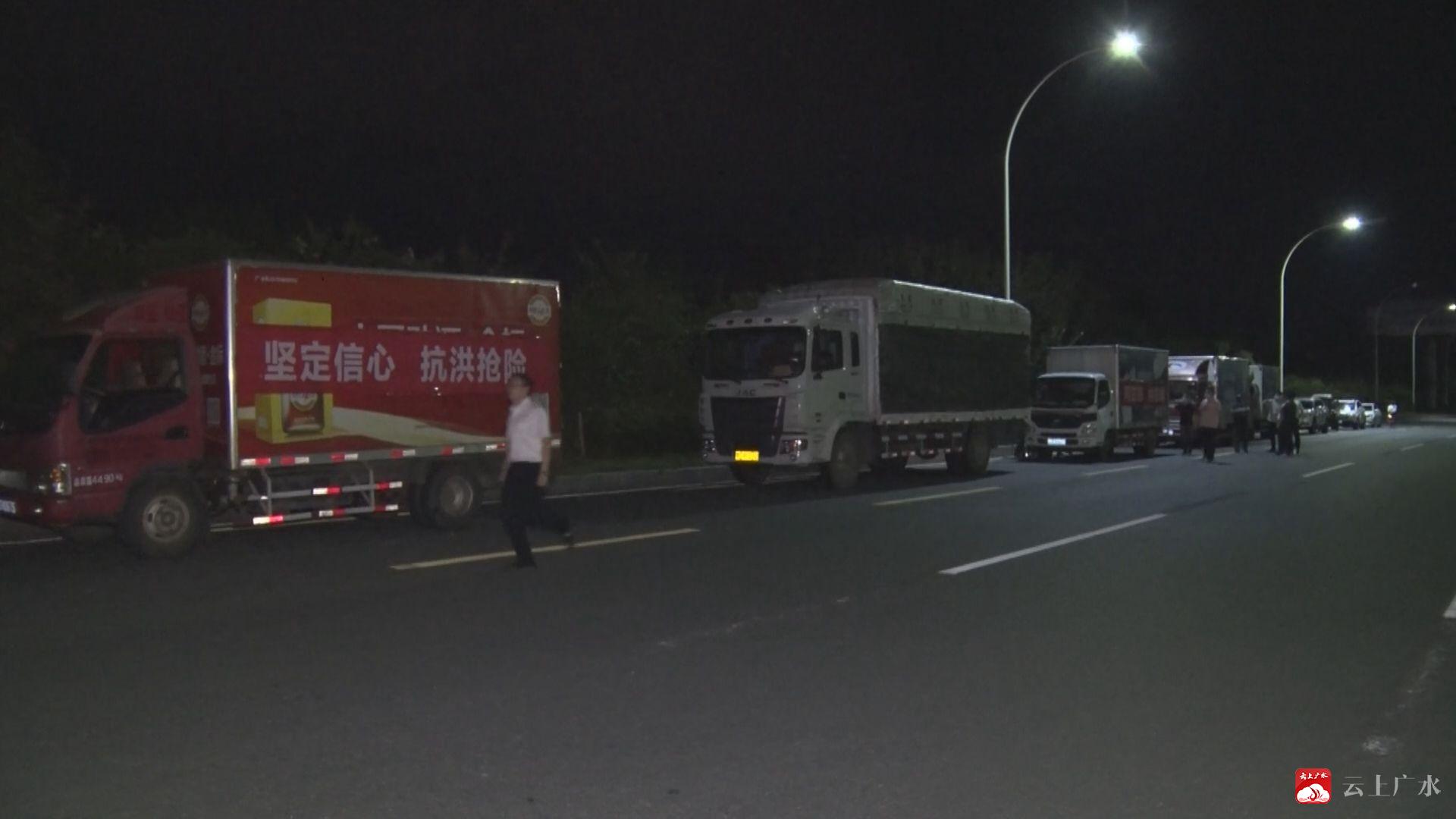 8月12日晚11时,装运应急救援物资的11辆货车在麻竹高速广水入口处集结。市委书记杨光胜,市委副书记、代理市长崔传金,市政协主席陈延涛,市人大常委会主任石守超,市委副书记刘秀玲,市委常委、统战部长黄河,市委常委、宣传部长王成民,副市长李承国到现场指挥调度,安排部署应急救援物资运输工作。