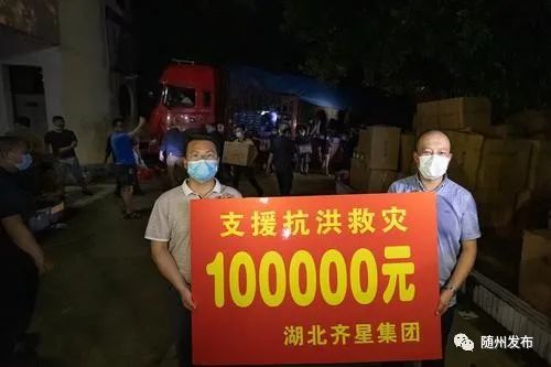 8月12日,湖北齐星集团名誉董事长徐德、董事长郑强,湖北江南专汽董事长甘子林紧急组织采购救灾物资,连夜送往随县柳林镇。齐星集团捐赠现金10万元及价值10万元的物资;江南专汽赠现金5万元及价值5万元的物资。