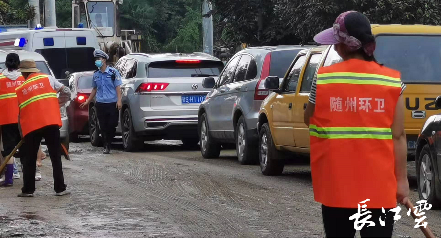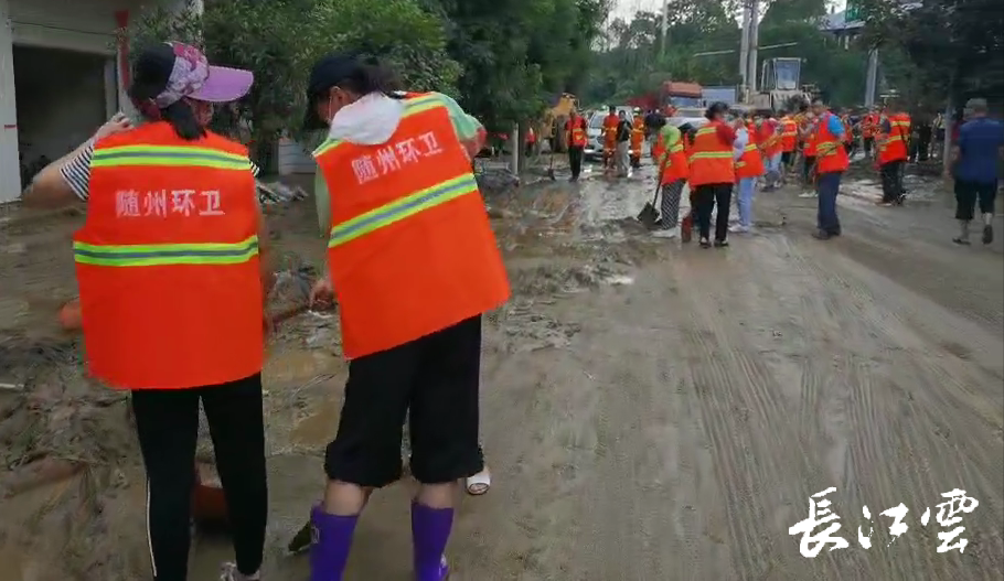 12日下午,随州市抽调环卫工作人员赶到柳林镇,协助居民一起清理房前屋后和街道路面的淤泥,记者在现场看到,工作人员挥汗如雨,泥水溅满一身。