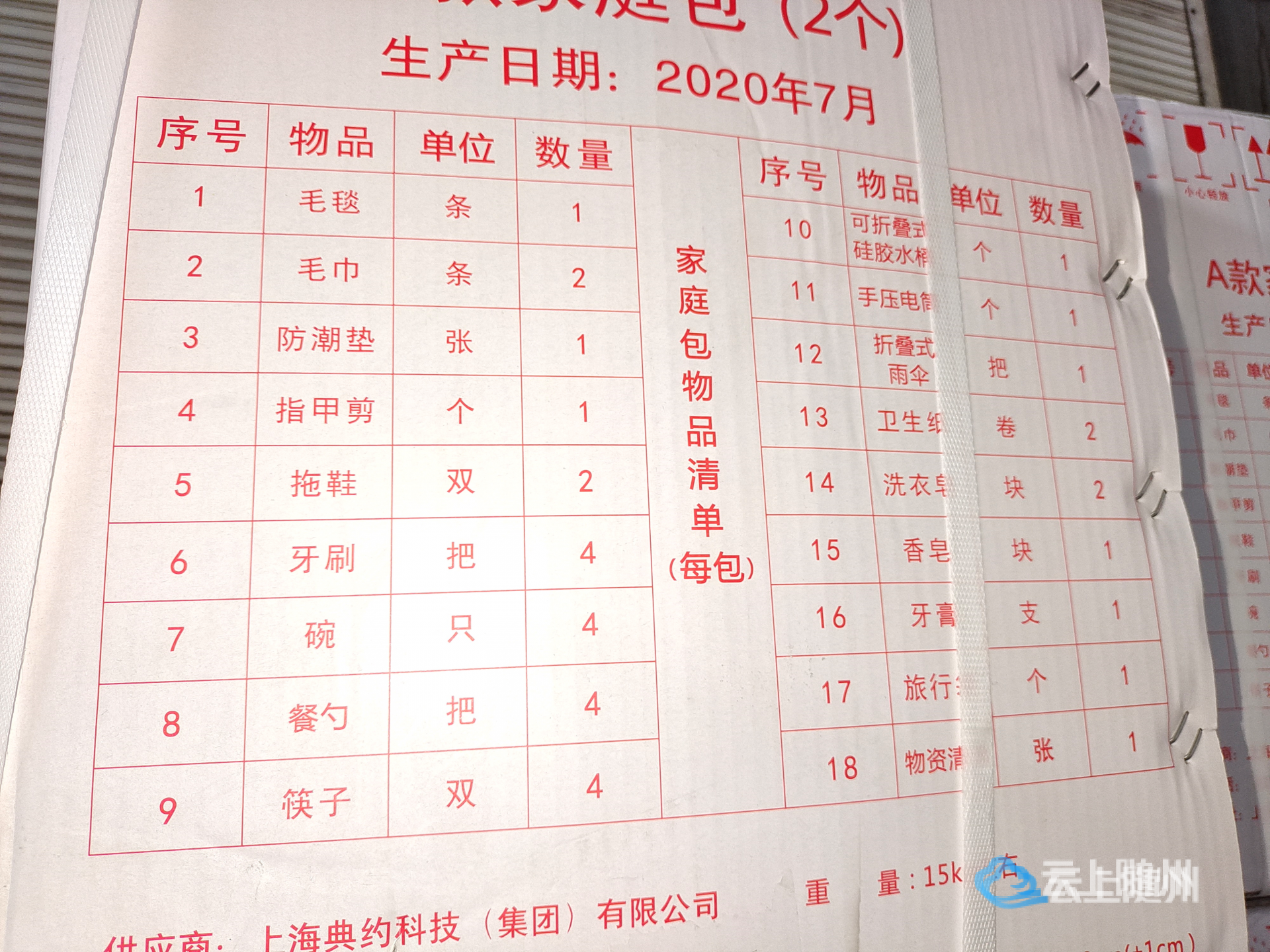 8月14日,由中国红十字会捐赠的首批860个家庭包运抵随县,随州市红十字会相关负责人介绍说,这种家庭包里面有毛毯,毛巾,防潮垫,牙刷,碗勺筷,可折叠水桶,折叠式雨伞,手压电筒,卫生纸,洗衣皂等等18种家居生活用品。