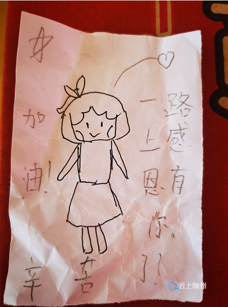 “看见叔叔姨姨们自发过来帮助我们,我和好朋友张舒晴一起商量,自己绘画送给他们。”提到创意的初衷,柳林镇第一小学五年级的肖鑫垚害羞地说道,我们都是中国人,“他们做好事不留名,我们就把自己想表达的心里话画下来、写出来,再送给他们。”