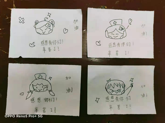 “辛苦啦”“加油”“感谢有你们”……从昨天到今天,肖鑫垚和张舒晴一起手绘了20余幅画,每一幅画上都留下了她们想对一线抗洪叔叔阿姨们所说的话。