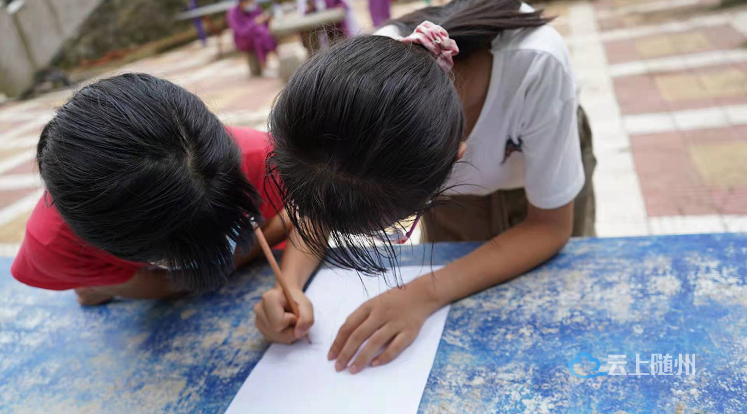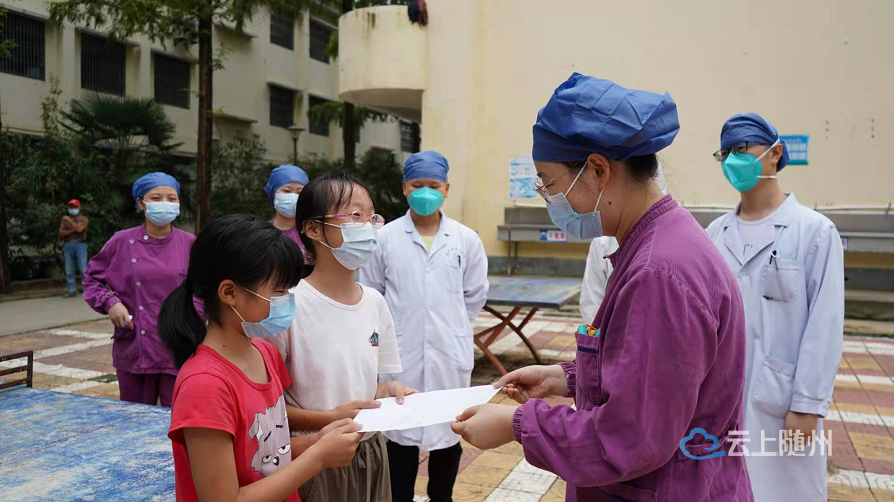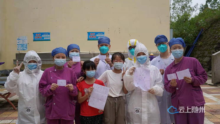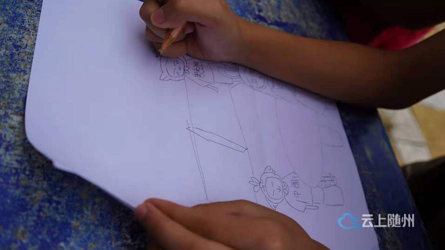 8月14日下午,肖鑫垚和张舒晴两个小女孩正趴在柳林镇中学集中安置点的乒乓球台上,专心致志地创作着手绘画,不一会儿,一幅集体画就创作完成,直接送到了随州市中心医院核酸采集小分队队长閤巧巧的手中。