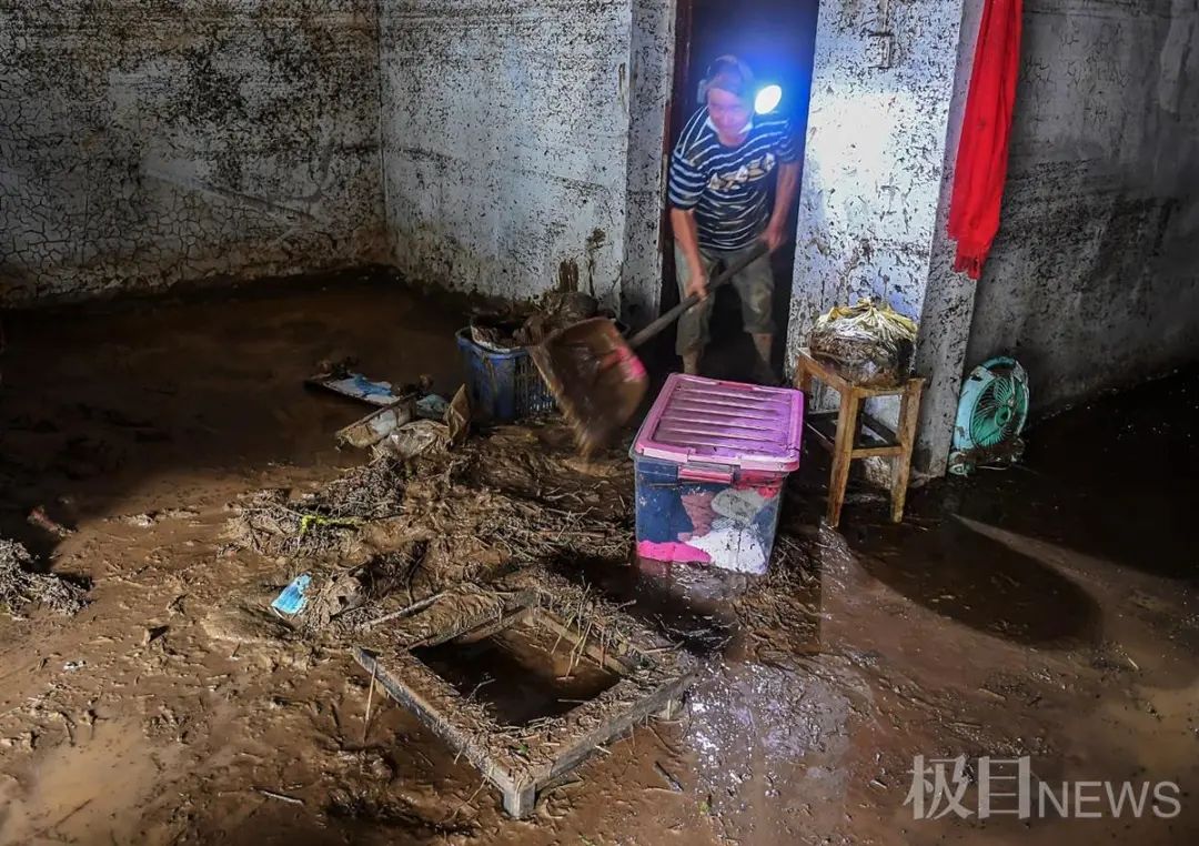 8月12日,受灾群众戴头灯清理灌进家里的泥水