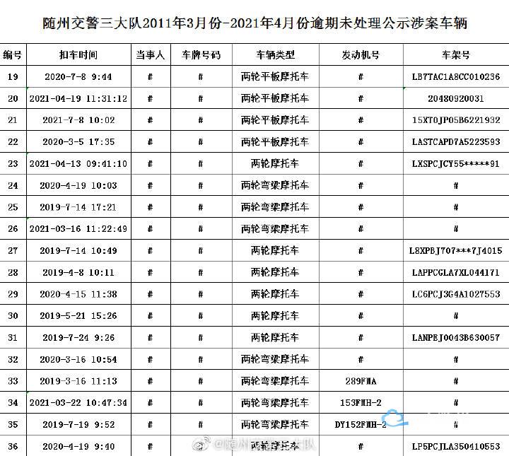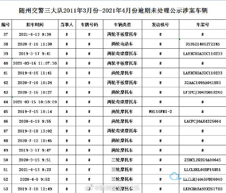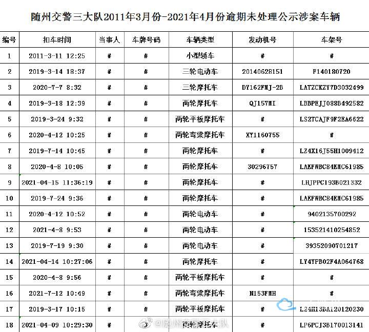 以下车辆在2011年03月至2021年04月期间因涉及道路交通违法,已被公安交通管理部门依法扣留,其驾驶人、所有人和管理人均未按规定期限到公安交通管理部门接受处理。根据《中华人民共和国道路交通安全法》第一百一十二条、《中华人民共和国道路交通安全法实施条例》第一百零七条等相关法律法规的规定,现予以公告。自本公告发布之日起经过三个月,当事人仍不前来接受处理的,公安交通管理部门将对扣留的车辆依法处理。