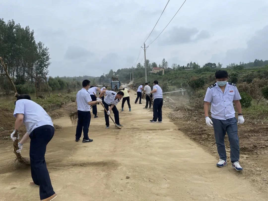 在何店镇王店村,税务干部手持铁锹帮忙清理路边淤泥、树枝等洪渣,挥动扫帚清扫路面,抢时间、抢速度恢复村主干道畅通。连夜接力搬卸救灾物资,向受灾村民发放水、米、面等救灾物资。