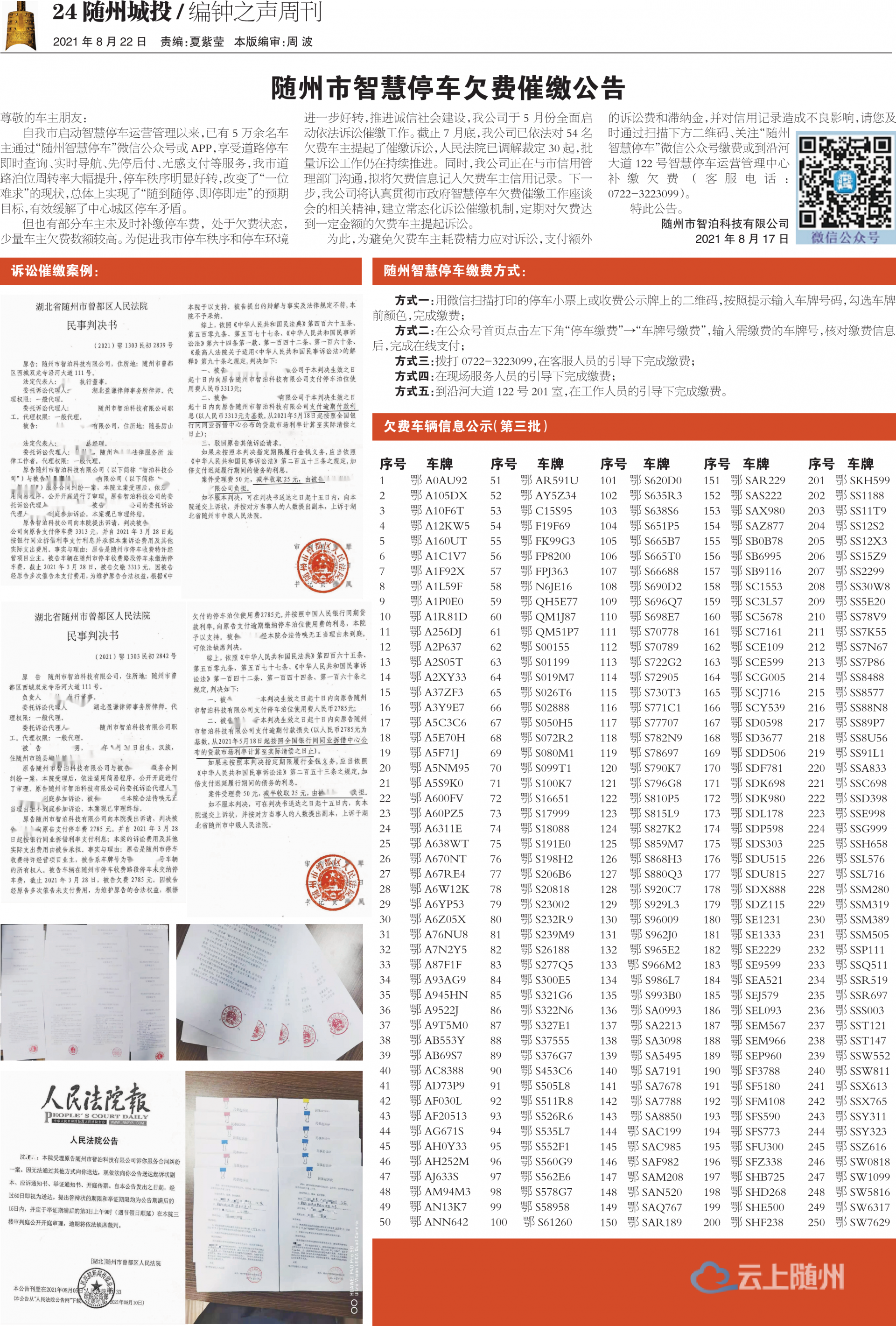 2021年8月22日24版《随州城投》(随州市智慧停车欠费催缴公告)