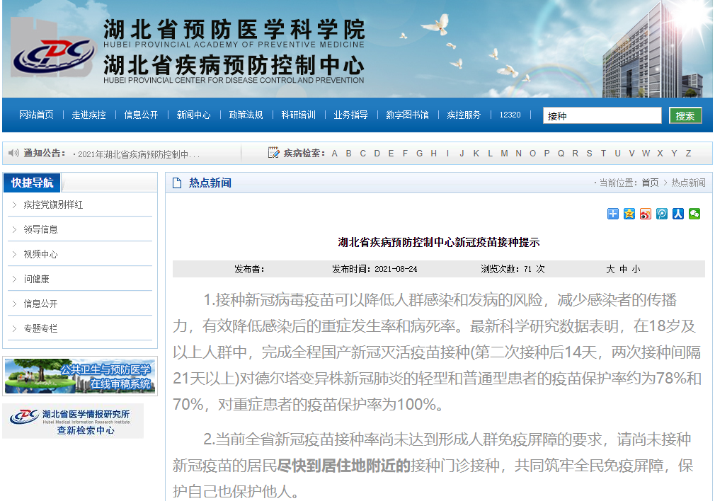 今天(8月24日),湖北省疾病预防控制中心发布新冠疫苗接种提示,提醒尚未接种新冠疫苗的居民尽快到居住地附近的接种门诊接种,共同筑牢全民免疫屏障。