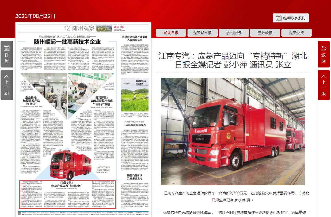 “这台车售价约700万元,是我们开发的高技术含量、高附加值的应急专用车产品,已经卖出15台。”8月19日,在湖北江南专用特种汽车有限公司生产车间,公司总经理甘子林自豪介绍,公司是我省唯一一家生产大型应急通讯指挥车的企业。去年,公司入选全国第二批专精特新“小巨人”企业。今年,入选第一批国家支持重点“小巨人”企业,是随州市专汽领域唯一一家。