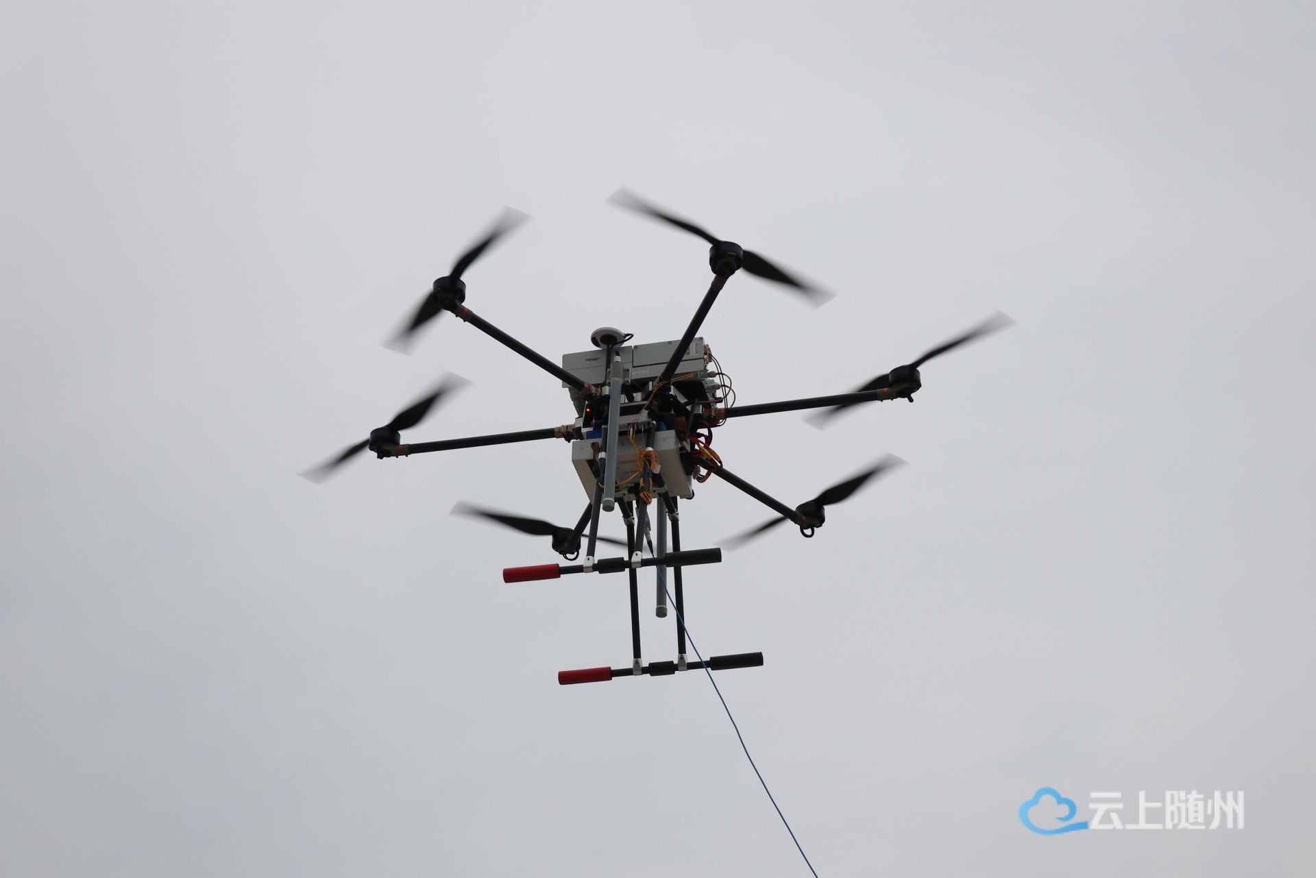 本次演练主体是利用一款长航时系留无人机系统,通过挂载通信设备进行更高效的应急通信保障。该无人机依靠地面系统外部供电完成长时间飞行作业,并将系统数据通过光纤回传到地面端,拥有充足的任务载荷空间,净载荷15kg,最大飞行高度为200m,挂载4G/5G基站类设备,可24小时不间断空中悬停作业,形成高空基站解决方案,为附近的用户提供语音、数据服务。