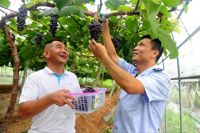 “今年年景好,葡萄大丰收,刚开始我非常担心葡萄销路,谢谢刘书记热心牵线,给我介绍了几个大客户。现在我种植的葡萄供不应求,今年预计可销售1.5万斤、25万元,产量和销售收入与去年相比都实现了翻番。葡萄在我眼里,是名副其实的‘金果果’!”汪志勇介绍道。