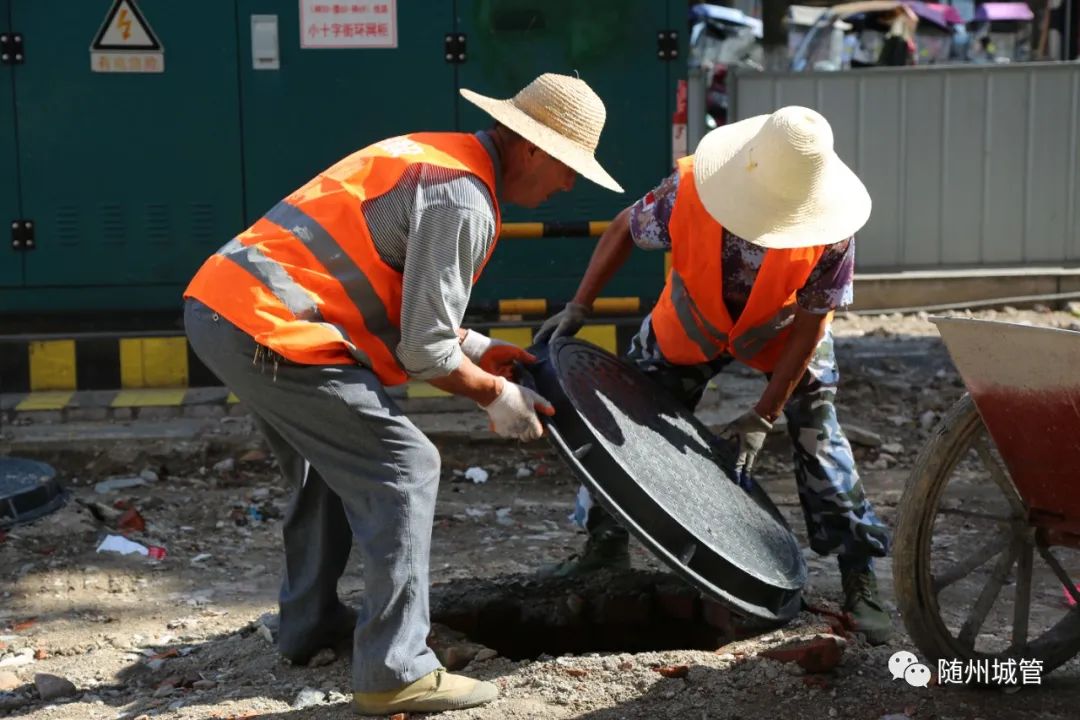 大家分工明确,协同配合,有条不紊,有的清理地基,有的加装井盖,有的和拌泥沙,有的铺装步道方砖……